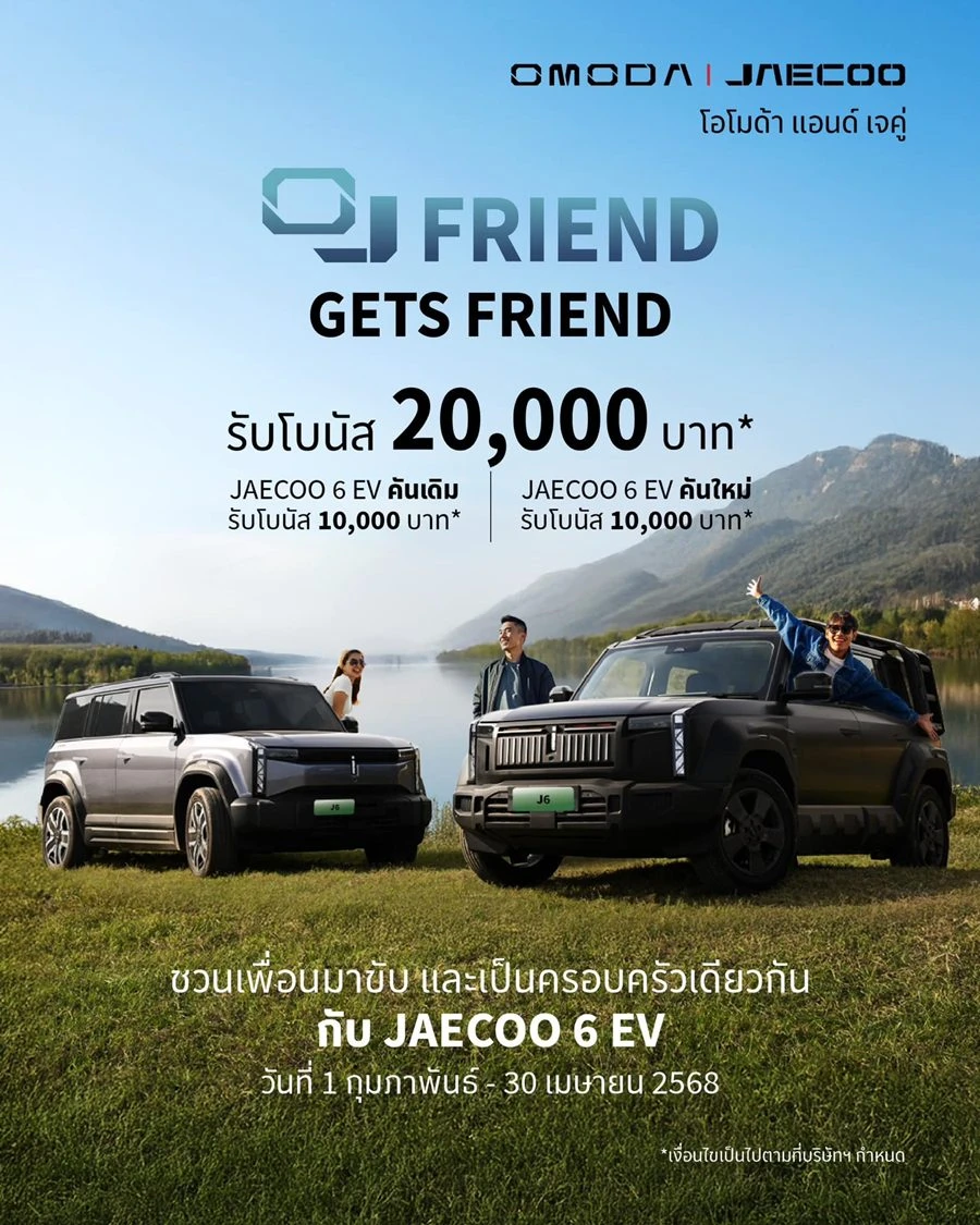 ข้อเสนอพิเศษที่ 4 OJ Friend gets Friend เมื่อชวนเพื่อนมาซื้อรถ JAECOO 6 EV รับโบนัสรวม 20,000 บาท 10,000 สำหรับ JAECOO 6 EV คันเก่า และ 10,000 สำหรับ JAECOO 6 EV คันใหม่* ตั้งแต่วันที่ 1 กุมภาพันธ์ – 30 เมษายน 2568