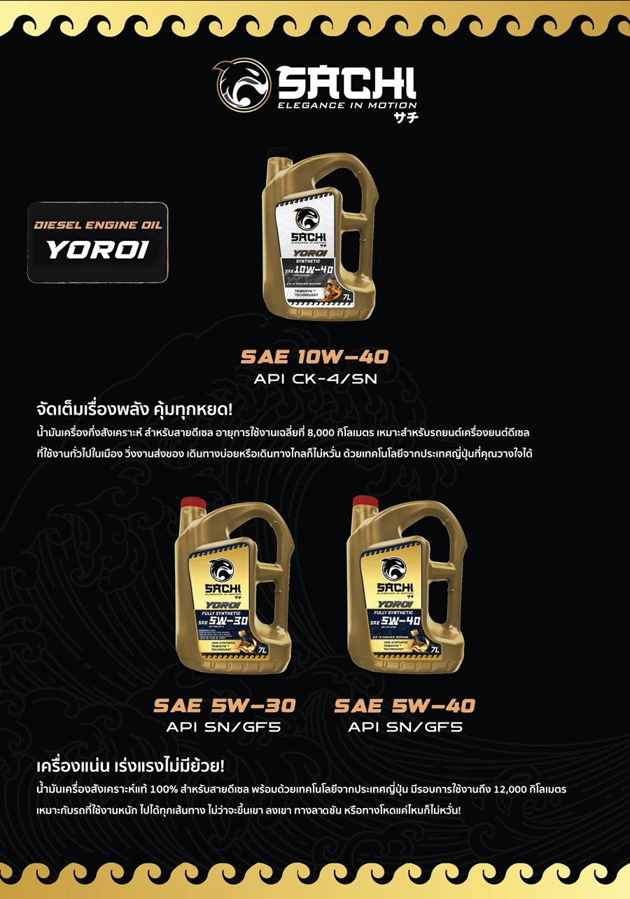 ถ้ารถคือชีวิต ถ้าความเร็วคือจิตวิญญาณของคุณและถ้าคุณหลงใหลในเสน่ห์ของ JDM อย่างแท้จริง SACHI (ซาชิ) คือคำตอบที่ใช่ที่สุดของคุณ! นี่คือน้ำมันเครื่องนวัตกรรมญี่ปุ่นที่เกิดมาเพื่อคนรักรถ ไม่ว่าคุณจะเป็นสายแต่งรถให้ดูเนี๊ยบแบบสตรีทคาร์ สายเรียบหรูแบบโชว์สไตล์ สายจัดเต็มพร้อมซัดทุกโค้ง สายขับเดลี่ไดรฟ์ในเมือง หรือสายรวมตัวออกทริปกับแก๊งค์ SACHI (ซาชิ) พร้อมซัพพอร์ตในทุกโมเมนต์ของคุณ ให้ทุกการขับขี่เป็นมากกว่าการเดินทาง แต่คือสไตล์ที่เป็นตัวเอง