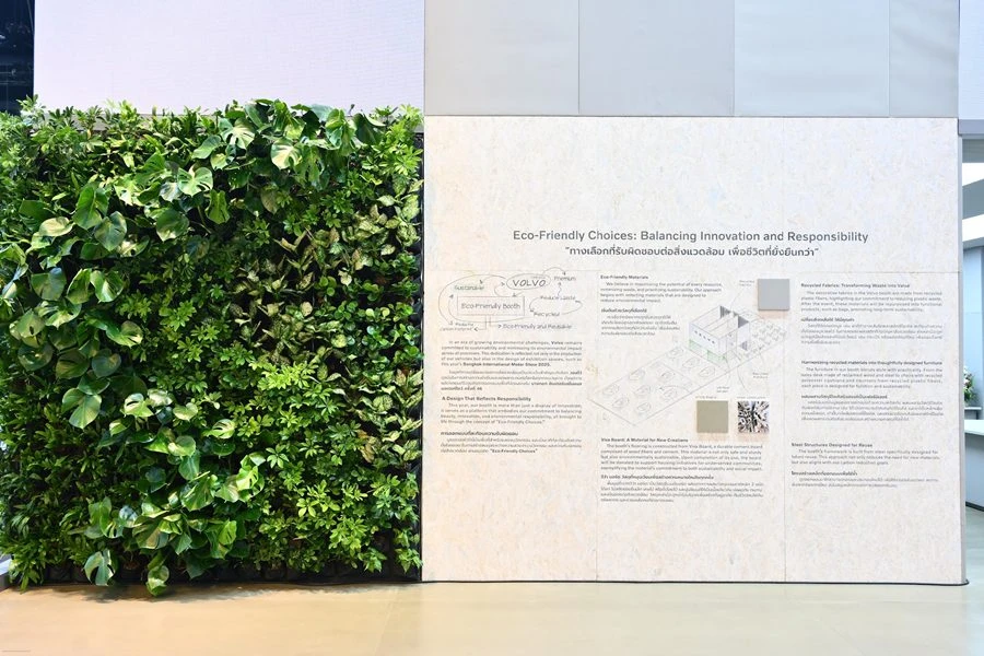 สานต่อจุดยืนในการออกแบบบูธที่มุ่งเน้นการสร้างความยั่งยืน ลดขยะ เพื่อลดปัญหาสิ่งแวดล้อมแบบองค์รวมต่อจากปีที่ผ่านมาด้วยดีไซน์ของบูธที่ยังคงเน้นใช้วัสดุที่สามารถนำกลับมาใช้ใหม่ได้ โดยในปีนี้บูธของ วอลโว่ คาร์ ได้คงทำเจตนารมย์เดิม ผ่านคอนเซ็ปต์การออกแบบที่แม้ดีไซน์จะเปลี่ยนไปเพื่อสร้างความน่าสนใจสำหรับผู้มาเยือน แต่รากฐานทางแนวคิดของการออกแบบยังคงเน้นย้ำถึงการนำเสนอทางเลือกที่เป็นมิตรกับสิ่งแวดล้อมเป็นสำคัญ โดยในปีนี้ 90% ของวัสดุที่นำมาใช้ในการสร้างบูธ วอลโว่ คาร์ คือวัสดุที่มาจากงานในครั้งก่อนหน้า
