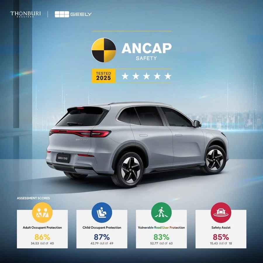 ANCAP ถือเป็นองค์กรระดับโลกด้านการประเมินความปลอดภัยของยานยนต์ที่ได้รับการยอมรับในระดับนานาชาติ โดยดำเนินการทดสอบการชนและการประเมินด้านความปลอดภัยอย่างเข้มงวด ครอบคลุมตั้งแต่การปกป้องผู้โดยสารทั้งเด็กและผู้ใหญ่ ตลอดจนผู้ร่วมใช้ถนน และประสิทธิภาพของระบบช่วยเหลือผู้ขับขี่ (ADAS) โดย GEELY EX5 ได้รับคะแนนความปลอดภัยในระดับสูงสุด 5 ดาวจากทั้งสององค์กร โดยเฉพาะอย่างยิ่งคะแนนระดับความปลอดภัย 5 ดาว ของ ANCAP ยังครอบคลุมทุกรุ่นย่อยของ GEELY EX5 ที่วางจำหน่ายในประเทศออสเตรเลียและนิวซีแลนด์อีกด้วย