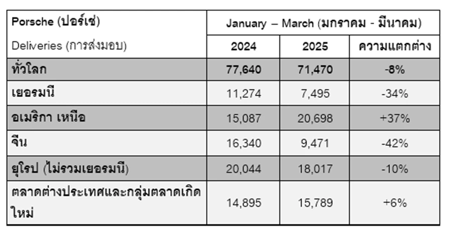 มาคันน์ (Macan) เพิ่มขึ้น 14% โดยส่วนใหญ่เป็นรุ่นไฟฟ้า ในแง่ของภูมิภาค อเมริกาเหนือ ยังคงเป็นตลาดที่ใหญ่ที่สุด เนื่องจากมีการส่งมอบรถมากถึง 20,698 คัน เพิ่มขึ้น 37% เมื่อเทียบกับช่วงเวลาเดียวกันของปีที่แล้ว แม้ว่ายอดรวมทั่วโลกจะลดลง 8% เมื่อเทียบกับตัวเลขของปีที่แล้ว แต่ยอดขายในแต่ละภูมิภาคยังคงมีความสมดุล