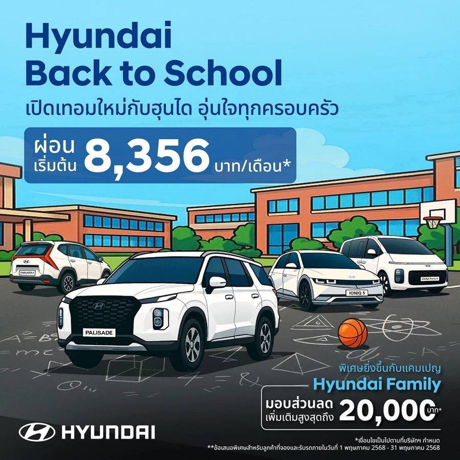 เพียงจองรถฮุนไดรุ่นใดก็ได้ ระหว่างวันที่ 13 - 19 พฤษภาคม 2568 และรับรถภายใน 30 มิถุนายน 2568 รับฟรี! Samsung Galaxy Tab A9 มูลค่า 5,990 บาท* สมาร์ตไอเท็มที่ช่วยให้เด็กๆ เรียนรู้ได้ทุกที่ทุกเวลา พร้อมข้อเสนอสุดคุ้มที่ออกแบบมาเพื่อ “ครอบครัวทุกสไตล์” ไม่ว่าจะเป็นสายเทคโนโลยี สายผจญภัย หรือคุณพ่อคุณแม่ยุคใหม่ ผ่อนต่ำ เริ่มต้นเพียง 8,356 บาทต่อเดือน* หรือรับส่วนลดเงินสดสูงสุด 280,000 บาท*