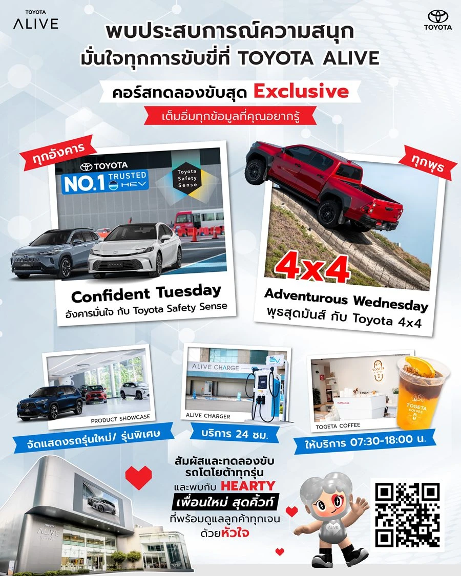 TOYOTA ALIVE ศูนย์รวมประสบการณ์ไลฟ์สไตล์และศูนย์ทดสอบรถยนต์ของโตโยต้า พร้อมขับเคลื่อนความสุขครั้งใหม่ กับการแนะนำกิจกรรมทดลองขับสุด EXCLUSIVE ภายใต้ชื่อ กิจกรรม “Confident Tuesday อังคารมั่นใจกับ Toyota Safety Sense” และ กิจกรรม “Adventurous Wednesday พุธสุดมันส์ กับโตโยต้า 4 x 4” ในทุกวันอังคารและพุธ ตลอดปี 2568 เพื่อเปิดโอกาสให้ลูกค้าเข้ามาสัมผัสเทคโนโลยี ผลิตภัณฑ์ และบริการของโตโยต้าได้ง่ายยิ่งขึ้น ให้เต็มอิ่มกับข้อมูลรถโตโยต้า ควบคู่ไปกับการมอบประสบการณ์ขับขี่ที่คุณพิสูจน์ได้ด้วยตัวเอง