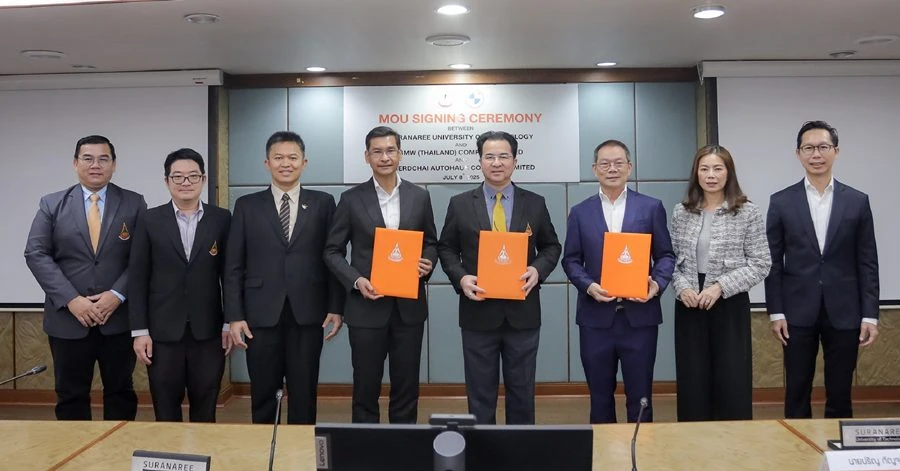 ในภาพจากซ้าย - ผู้ช่วยศาสตราจารย์ ดร.สงบ คำค้อ อาจารย์ประจำสำนักวิชาวิศวกรรมศาสตร์, ดร.วรวัฒน์ มีวาสนา อาจารย์ประจำสำนักวิชาวิทยาศาสตร์, ศาสตราจารย์ ดร. สันติ แม้นศิริ คณบดีสำนักวิชาวิทยาศาสตร์, คุณกฤษฎา อุตตโมทย์ ผู้อำนวยการฝ่ายสื่อสารกิจการองค์กร บีเอ็มดับเบิลยู กรุ๊ป ประเทศไทย, รองศาสตราจารย์ ดร.อนันต์ ทองระอา อธิการบดี มหาวิทยาลัยเทคโนโลยีสุรนารี, คุณปริญ กัญจนาทิพย์ กรรมการผู้จัดการ เชิดชัย ออโต้เฮ้าส์, คุณกฤตกมล กัญจนาทิพย์ รองกรรมการผู้จัดการ เชิดชัย ออโต้เฮ้าส์ และคุณรอน ศิริวันสาณฑ์ ผู้อำนวยการฝ่ายรัฐกิจสัมพันธ์ บีเอ็มดับเบิลยู กรุ๊ป ประเทศไทย