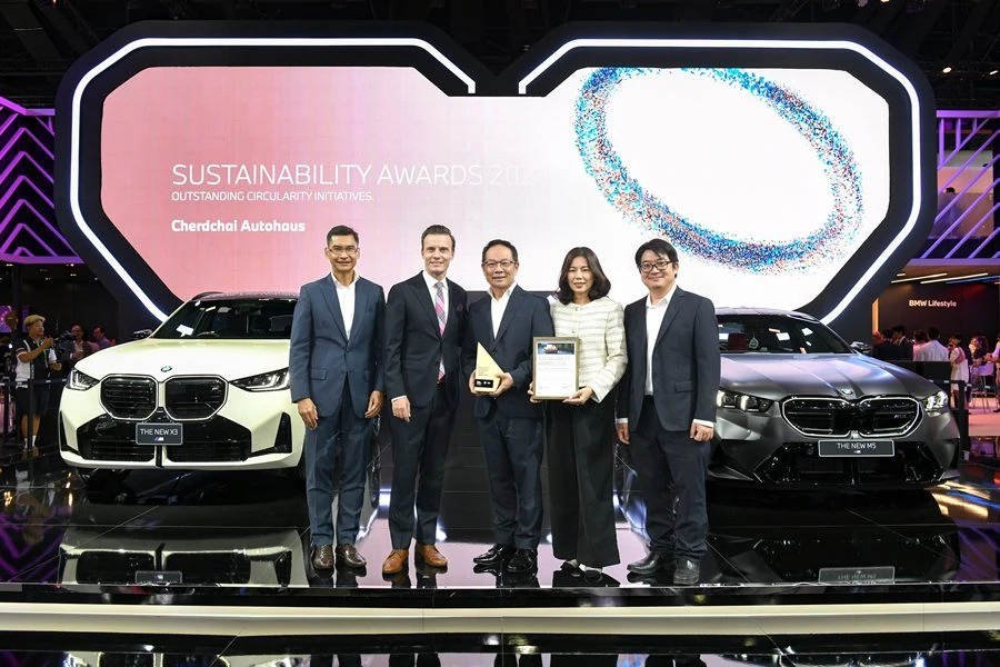 คุณปริญ กัญจนาทิพย์ (กลาง) กรรมการผู้จัดการ และคุณกฤตกมล กัญจนาทิพย์ (ที่ 4 จากซ้าย) รองกรรมการผู้จัดการ บริษัท เชิดชัย ออโต้เฮ้าส์ จำกัด พร้อมด้วย รศ.ดร.วรวัฒน์ มีวาสนา (ขวาสุด) รองผู้อำนวยการเทคโนธานี มหาวิทยาลัยเทคโนโลยีสุรนารี ร่วมรับมอบรางวัลยอดเยี่ยมด้านแนวคิดเศรษฐกิจหมุนเวียนจาก มร. เรเน่ แกร์ฮาร์ด (ที่ 2 จากซ้าย) ประธานและซีอีโอ และคุณกฤษฎา อุตตโมทย์ (ซ้ายสุด) ผู้อำนวยการฝ่ายสื่อสารกิจการองค์กร บีเอ็มดับเบิลยู กรุ๊ป ประเทศไทย