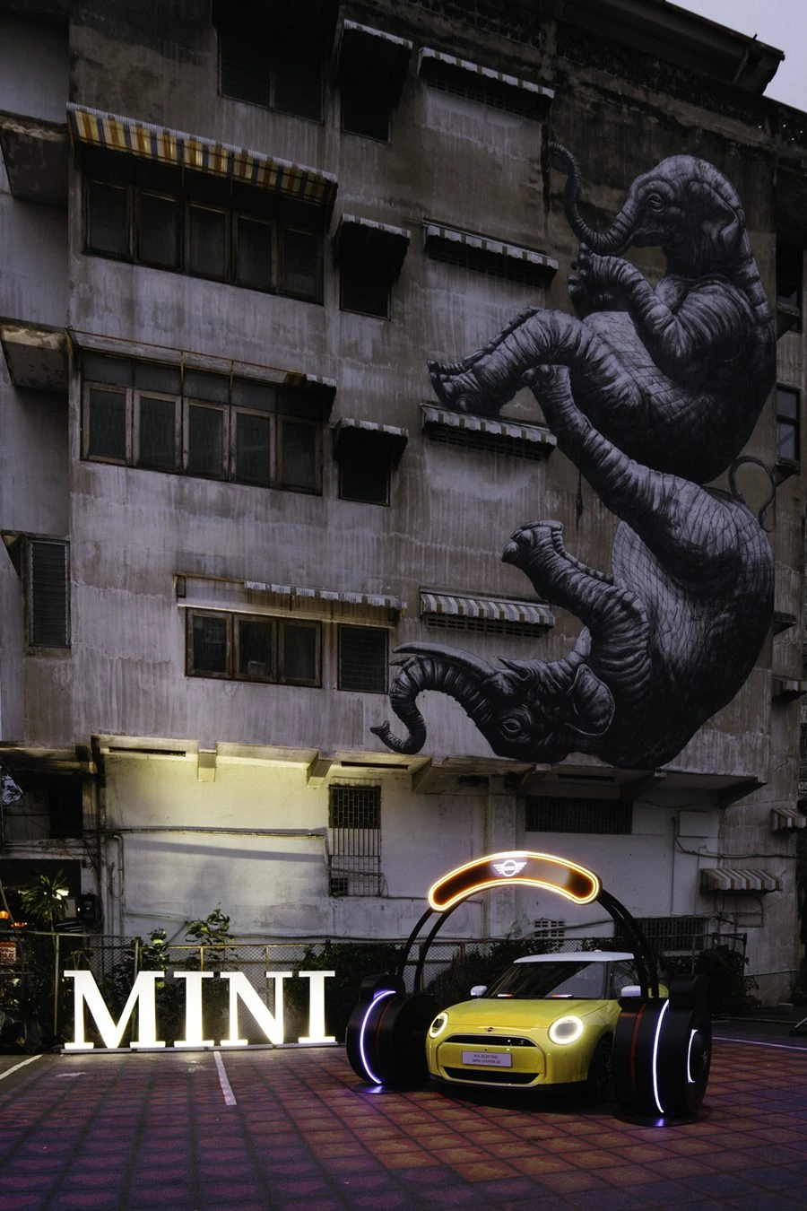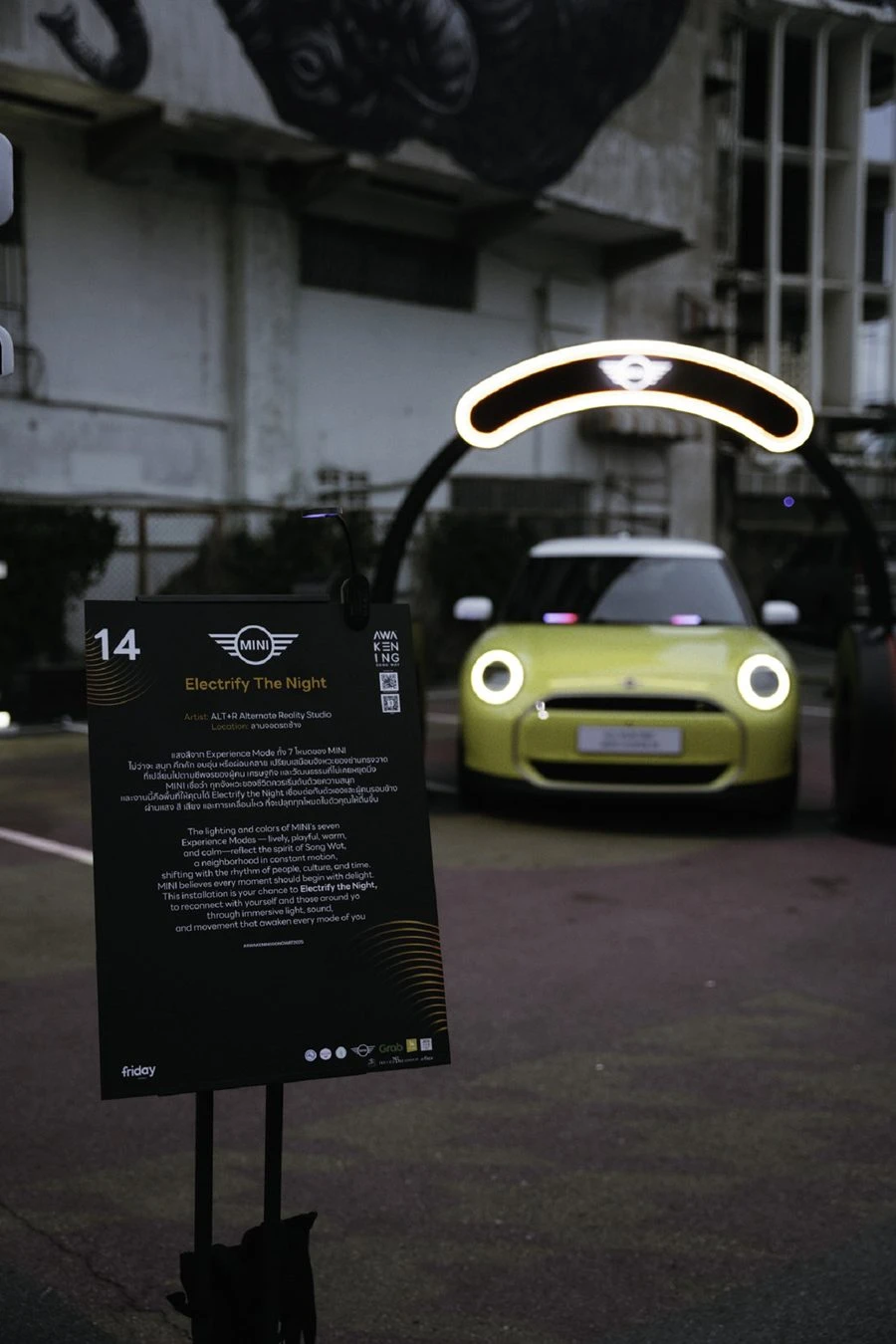 ภายในลานจอดรถช้างถูกเปลี่ยนโฉมเป็นพื้นที่ให้ทุกคนได้สัมผัสกับค่ำคืนที่ส่องประกายในธีม “Electrify the Night” ที่จะเชื่อมต่อตัวเองกับผู้คนรอบข้าง ผ่านแสง สี เสียง และการเคลื่อนไหว ปลุกทุกจังหวะความสนุก ด้วยโหมดการขับขี่ที่หลากหลายจาก มินิ ผู้เข้าชมจะได้พบกับไฮไลท์สำคัญคือ มินิ คูเปอร์ เอสอี ในสีเหลือง Sunny Side Yellow สดใสที่ถูกห้อมล้อมด้วยหูฟังเรืองแสงดีไซน์สุดเก๋ และดื่มด่ำกับการแสดงแสงสีที่ได้รับแรงบันดาลใจจาก Experience Mode ทั้ง 7 โหมดของมินิ ไม่ว่าจะเป็นแสงที่ให้ฟีลลิ่งสนุกสดใส คึกคัก อบอุ่น หรือแสงที่ผ่อนคลาย เหมือนกับจังหวะของย่านทรงวาด ที่เปลี่ยนไปตามชีพจรของผู้คน เศรษฐกิจ และวัฒนธรรม ที่ไม่เคยหยุดนิ่ง ผสานไปกับการฉายภาพศิลปะแบบ projection mapping บนพื้นที่เคลื่อนไหวไปตามไดนามิกของเพลง ซึ่งสามารถปรับเปลี่ยนบรรยากาศศิลปะได้ตามโหมดต่าง ๆ ของมินิทั้ง 7 โหมด ไม่ว่าจะเป็น Core Mode, Go-Kart Mode, หรือ Personal Mode