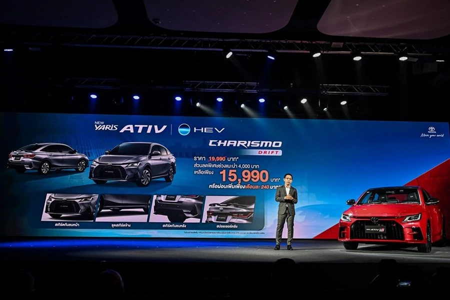 ซึ่งนอกเหนือจากดีไซน์ภายนอกซึ่งได้รับการยอมรับเป็นอย่างดี และภายในของรถที่มีอุปกรณ์อำนวยความสะดวกครบครันแล้ว ยังมีการปรับขนาดของเครื่องยนต์จาก 1.2 ลิตร เป็น 1.5 ลิตร และดัวยเทคโนโลยีไฮบริดที่เชื่อถือได้ของโตโยต้า NEW YARIS ATIV HEV สามารถมอบสมรรถนะอันทรงพลังและประสบการณ์การขับขี่ที่สนุกสนาน โดยมีอัตราสิ้นการใช้เชื้อเพลิงไฮบริดที่ดีที่สุดในประเทศไทย ที่ 29.4 กม./ลิตร และสำหรับ รุ่น HEV GR Sport ยังโดดเด่นด้วยดีไซน์สปอร์ตและระบบช่วงล่างที่เป็นเอกลักษณ์ มอบประสบการณ์การขับขี่ที่สนุกสนานยิ่งขึ้น เราภูมิใจที่ได้มีส่วนร่วมในการสนับสนุนเศรษฐกิจไทยต่อไป โดย NEW YARIS ATIV HEV จะใช้ชิ้นส่วนภายในประเทศเริ่มต้นที่ 65% โดยเรามีแผนที่จะเพิ่มให้มากขึ้น รวมทั้ง มีการส่งออกรถรุ่นนี้ไปยัง 23 ประเทศอีกด้วย