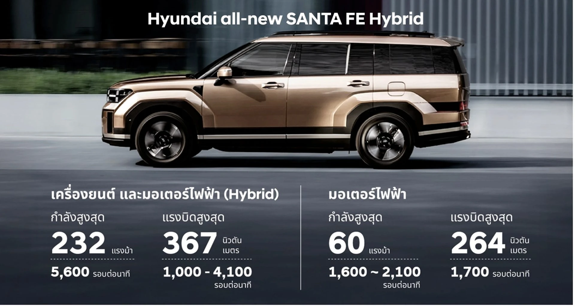 all-new SANTA FE Hybrid โดดเด่นด้วยการเลือกใช้ระบบขับเคลื่อนแบบ Parallel Hybrid ที่ถูกออกแบบมาเพื่อมอบทั้งสมรรถนะและความประหยัดในรูปแบบที่แตกต่าง โดยผสานเครื่องยนต์เบนซินเทอร์โบ 1.6 ลิตร เข้ากับมอเตอร์ไฟฟ้าและแบตเตอรี่ลิเธียมไอออนโพลิเมอร์ขนาด 1.49 kWh ส่งกำลังรวมสูงสุด 232 แรงม้า ที่ 5,600 รอบ/นาที และแรงบิดมหาศาลถึง 367 นิวตัน-เมตร ที่ 1,000–4,100 รอบ/นาที พร้อมมาตรฐานไอเสีย Euro 6 ที่เป็นมิตรต่อสิ่งแวดล้อม รองรับระบบขับเคลื่อนล้อหน้า (FWD) ที่ปรับตัวได้กับทุกสภาพถนน มอบอัตราการประหยัดน้ำมันเฉลี่ยสูงสุดถึง 19.6 กม./ลิตร ด้วยขุมพลังไฟฟ้าขนาด 60 กิโลวัตต์ พร้อมการทำงานผสานกันระหว่างเครื่องยนต์ มอเตอร์ไฟฟ้าและเกียร์อัตโนมัติ 6 จังหวะเป็นหนึ่งเดียว อย่างราบรื่นไม่มีสะดุด ซึ่งคือแก่นแท้ของเทคโนโลยี Parallel Hybrid และเป็นสิ่งที่ทำให้ Hyundai all-new SANTA FE Hybrid แตกต่างอย่างชัดเจนในโลกของรถไฮบริดยุคใหม่
