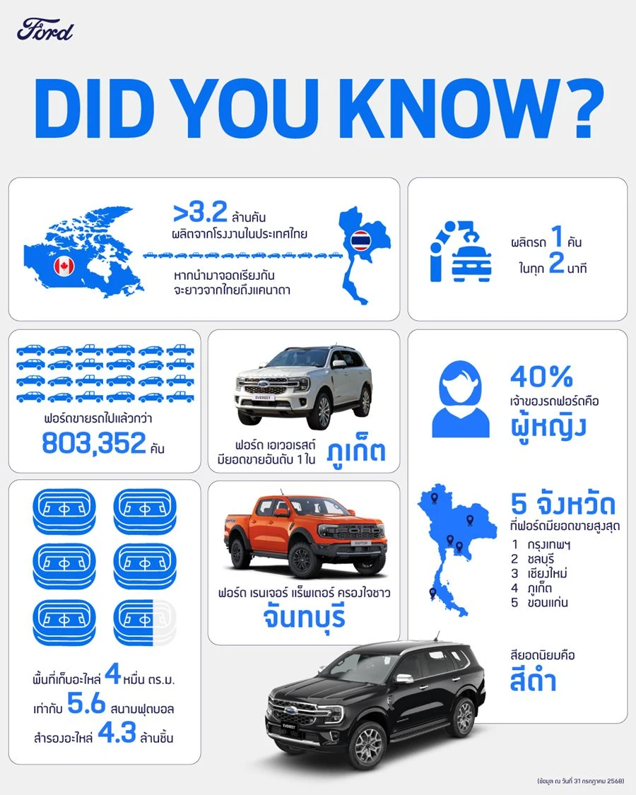 นับตั้งแต่วันแรกที่เริ่มดำเนินธุรกิจในเมืองไทยจนถึงปัจจุบัน ฟอร์ดได้ส่งมอบรถยนต์ให้ลูกค้าชาวไทยไปแล้วกว่า 803,352 คัน (ข้อมูล ณ วันที่ 31 กรกฎาคม 2568) เป็นตัวเลขที่สะท้อนถึงความไว้วางใจอย่างต่อเนื่องจากผู้บริโภค นอกจากนี้ จากข้อมูล 4 ปีย้อนหลัง (พ.ศ. 25264-2568) พบว่า สีดำ เป็นสีที่ลูกค้าฟอร์ดในไทยนิยมมากที่สุดเพราะสะท้อนภาพลักษณ์ความเท่ แกร่งและความดุดันที่เป็นเอกลักษณ์ของแบรนด์ได้อย่างชัดเจน