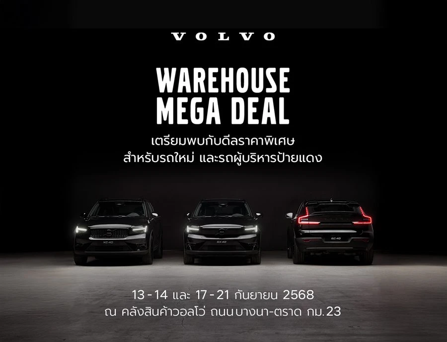 ระหว่างวันที่ 13 - 14 และ 17 - 21 กันยายน พ.ศ. 2568 ตั้งแต่เวลา 10.00 - 18.00 น. ณ คลังสินค้าวอลโว่ ถนนบางนา-ตราด กม. 23 งาน Volvo Warehouse Mega Deal คืองานที่ผู้สนใจเป็นเจ้าของรถวอลโว่ไม่ควรพลาด เนื่องจากเป็นงานเดียวที่ผู้สนใจสามารถเลือกชมรถทุกรุ่น ทุกสี ที่พร้อมจำหน่าย พร้อมทดลองขับได้ตรงจากคลังสินค้าวอลโว่ และรับข้อเสนอเพื่อส่งเสริมการขายสุดพิเศษ อาทิ
