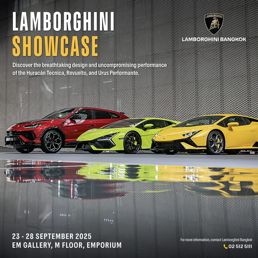 บริษัท เรนาสโซ มอเตอร์ จำกัด ตัวแทนจำหน่ายรถยนต์ ลัมโบร์กินี อย่างเป็นทางการรายเดียวในประเทศไทย นำโดย อภิชาติ ลีนุตพงษ์ ประธานกรรมการ, ศักดิ์ นานา และ ม.ล.พลอยนภัส ลีนุตพงษ์ กรรมการ ยกทัพจัดแสดงที่สุดแห่งขุมพลังไฮบริด Lamborghini Revuelto และ The Last NA รุ่นไอคอนิกระดับตำนาน อย่าง Huracan Tecnica และ Urus Performante ในงาน LAMBORGHINI SHOWCASE 2025 ภายในงานเหล่าสาวกกระทิงดุเตรียมสัมผัสตัวจริงกันอย่างใกล้ชิด นอกจากนี้ยังมีสินค้าคอลเลกชันลัมโบร์กินีให้เหล่าแฟนพันธุ์แท้ได้เลือกช้อปกัน ระหว่างวันที่ 23-28 กันยายน 2568 ณ ดิเอ็มโพเรียม, EM Gallery ชั้น M