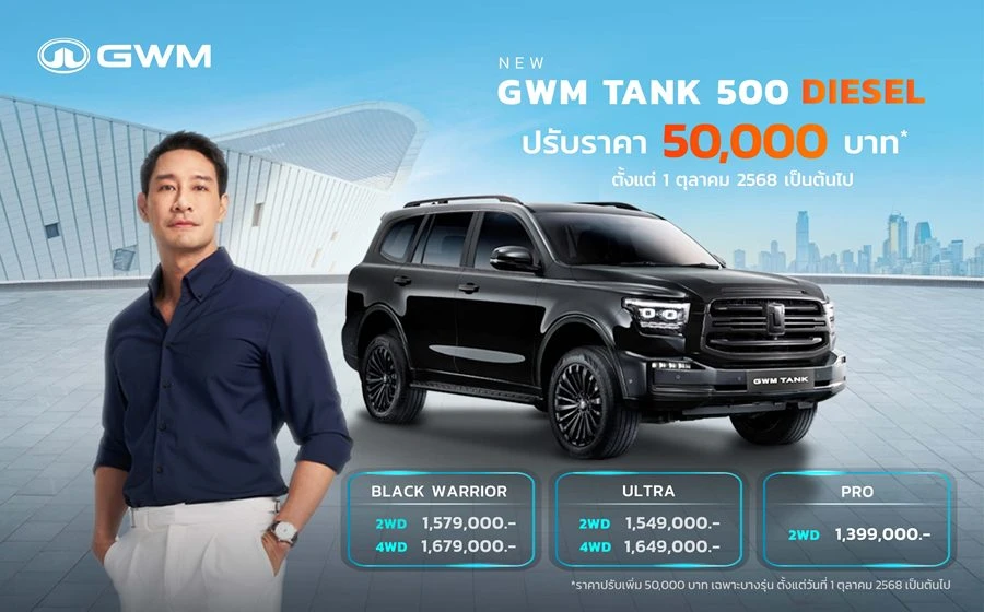 เพื่อมอบประสบการณ์พิเศษแก่ลูกค้าคนสำคัญ โดยความสำเร็จก้าวแรกในไทยครั้งนี้ ถือเป็นการก้าวสู่การเป็นผู้นำในกลุ่มรถยนต์เอสยูวีพรีเมียม 7 ที่นั่ง โดย NEW GWM TANK 500 DIESEL ผสานแนวคิด “Go Beyond” มอบประสบการณ์การขับขี่ที่เหนือกว่าทั้ง 4 ด้านอย่างครอบคลุม ได้แก่ 1.) ความพรีเมียมตั้งแต่ภายนอกสู่ภายใน 2.) ความสบายเหนือระดับด้วยฟังก์ชันอำนวยความสะดวกมากมาย 3.) เทคโนโลยีอัจฉริยะอันล้ำสมัย และ 4.) ความปลอดภัยที่อัดแน่นสร้างความมั่นใจให้ในทุกเส้นทาง โดยหลังจากได้รับกระแสตอบรับเป็นอย่างดีทั่วประเทศหลังเปิดตัวด้วยราคาแนะนำ ล่าสุด GWM (Thailand) ประกาศปรับราคาใหม่เพิ่มขึ้น 50,000 บาท สำหรับรุ่น ULTRA และ ULTRA Black Warrior ทั้งระบบขับเคลื่อน 2 ล้อ และ 4 ล้อ โดยจะมีผลตั้งแต่วันที่ 1 ตุลาคม 2568 เป็นต้นไป ขณะที่รุ่น PRO จะยังคงราคาเริ่มต้นไว้ที่ราคาเดิม เพื่อแสดงความขอบคุณแก่ลูกค้าชาวไทย และมอบโอกาสในการเป็นเจ้าของ NEW GWM TANK 500 DIESEL ในราคาที่เข้าถึงได้ง่ายยิ่งขึ้น