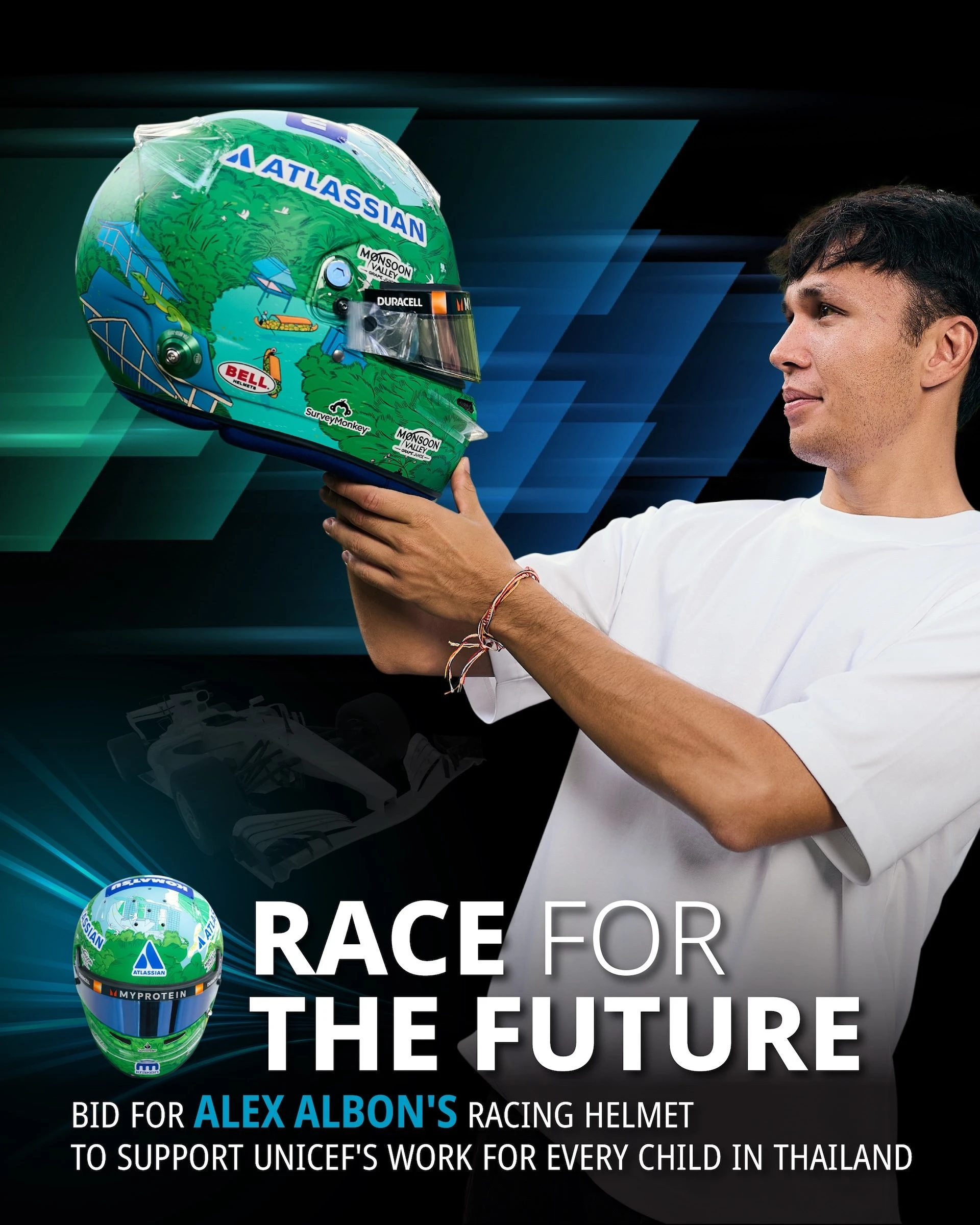 การประมูลเริ่มต้นที่ 450,000 บาท (ประมาณ 14,100 ดอลลาร์สหรัฐ) เปิดแล้ววันนี้จนถึงวันที่ 15 ตุลาคม 2568 ที่ www.unicef.or.th/alex อัลบอน เป็นลูกครึ่งไทย-อังกฤษ เกิดที่สหราชอาณาจักร โดยมีมารดาเป็นชาวไทย เขาลงแข่งขันภายใต้ธงชาติไทยตลอดเส้นทางอาชีพ ตั้งแต่การแข่งรถโกคาร์ทเมื่ออายุ 7 ขวบ จนก้าวสู่เวทีระดับโลก และได้กลายเป็นแรงบันดาลใจให้กับเด็กและเยาวชนทั่วประเทศ ในปี 2563 อัลบอนสร้างประวัติศาสตร์ด้วยการเป็นนักแข่งชาวไทยคนแรกที่ขึ้นโพเดียมในฟอร์มูล่าวัน ทัสกันกรังด์ปรีซ์ และในปี 2564 เขายังเป็นนักแข่งชาวไทยคนแรกที่คว้าชัยชนะในรายการ Deutsche Tourenwagen Masters หรือ DTM การมอบหมวกกันน็อกในครั้งนี้จึงสะท้อนถึงความตั้งใจของอัลบอน ในการมอบโอกาสให้เด็กในประเทศไทยได้เติบโตและพัฒนาศักยภาพอย่างเต็มที่