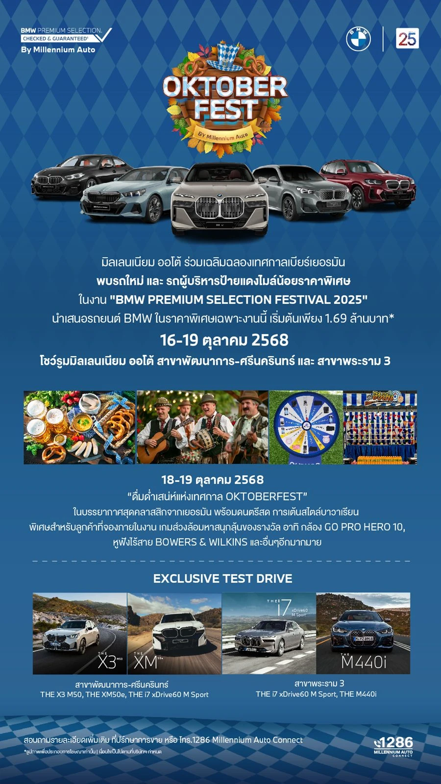 บริษัท มิลเลนเนียม ออโต้ กรุ๊ป จำกัด ผู้จำหน่ายรถยนต์ บีเอ็มดับเบิลยู, มินิ และ มอเตอร์ไซค์ บีเอ็มดับเบิลยู มอเตอร์ราด อย่างเป็นทางการในประเทศไทย ภายใต้บริษัท มิลเลนเนียม กรุ๊ป คอร์ปอเรชั่น (เอเชีย) จำกัด (มหาชน) หรือ MGC-ASIA จัดงาน Oktoberfest by Millennium Auto ระหว่างวันที่ 16–19 ตุลาคม 2568 ณ โชว์รูม บีเอ็มดับเบิลยู มิลเลนเนียม ออโต้ สาขาพัฒนาการ-ศรีนครินทร์ และสาขาพระราม 3