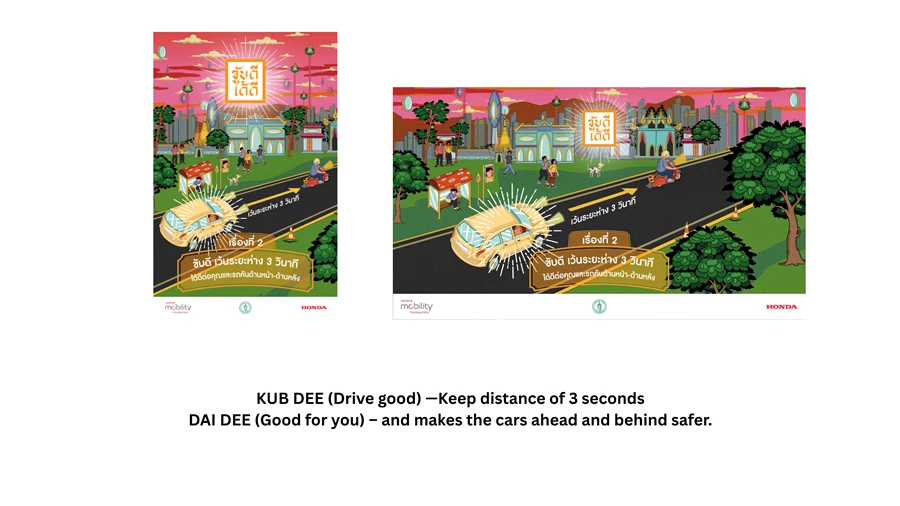 TMF และ Honda มุ่งหวังที่จะสร้างสังคมการขับขี่ที่ปลอดภัย ซึ่งผู้ใช้รถยนต์และรถจักรยานยนต์ต่างมีความเอื้อเฟื้อและใส่ใจต่อกัน ภายใต้แนวคิด ขับดี (KUB-DEE) แคมเปญได้หยิบยกพฤติกรรมในชีวิตประจำวัน เช่น การสังเกตและระมัดระวังรถจักรยานยนต์ในขณะขับขี่ การตรวจสอบจุดอับสายตา และการเว้นระยะห่างที่ปลอดภัย — มานำเสนอเป็นตัวอย่างของ พฤติกรรมการขับขี่ที่ดี