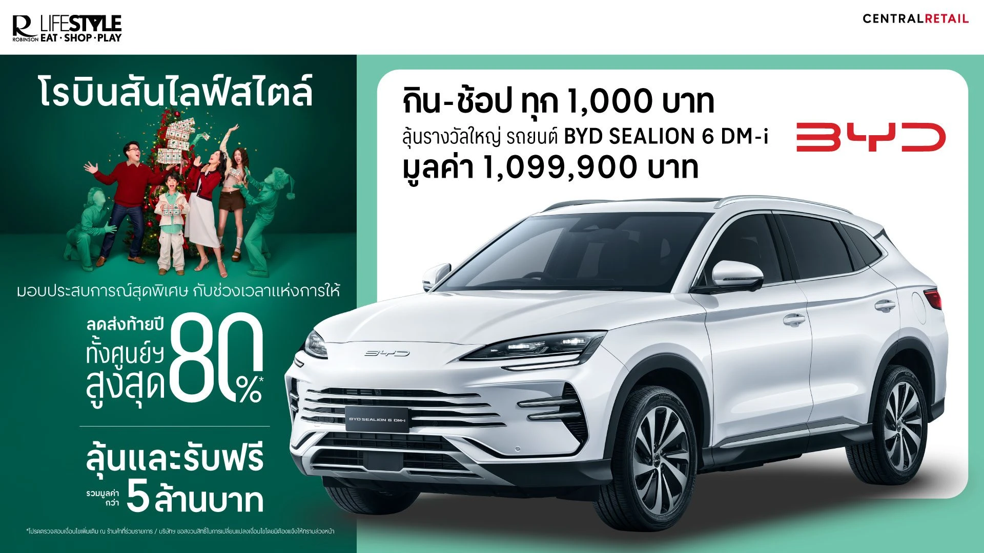 ร่วมเป็นส่วนหนึ่งของประสบการณ์แห่งความสุขส่งท้ายปี กับแคมเปญ “โรบินสันไลฟ์สไตล์ มอบประสบการณ์พิเศษ กับช่วงเวลาแห่งการให้” เพียงช้อปครบตามเงื่อนไข รับสิทธิ์ลุ้นรางวัลใหญ่รถยนต์ปลั๊กอินไฮบริด BYD รุ่น SEALION 6 DM-i มูลค่า 1.09 ล้านบาทพร้อมดีลสุดคุ้มจากหลากหลายร้านค้า ตั้งแต่วันนี้ – 4 ม.ค. 69 ที่ศูนย์การค้าโรบินสันไลฟ์สไตล์ทุกสาขา ทั่วประเทศ