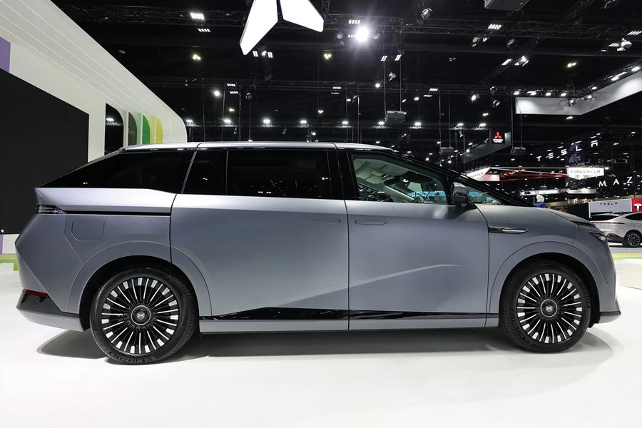 รถตู้ไฟฟ้าทรงสปอร์ตอัจฉริยะรุ่นท็อป โดดเด่นด้วยสีภายนอก Matte Gray ครั้งแรกในตลาด MPV ไฟฟ้า สอดรับกับเฉดสีภายในใหม่ Light Gray เบาะหนังแท้แนปป้า (Nappa) ผสานฟังก์ชัน Zero-gravity หรูหรามีระดับ เบาะนั่งแถวสองปรับไฟฟ้าได้ 18 ทิศทาง พร้อมที่ชาร์จแบบไร้สาย 50 วัตต์ ล้ออัลลอยใหม่ดีไซน์แบบ Starlight Floating Wheels ขนาด 20 นิ้ว ผสานการขับเคลื่อนด้วยเทคโนโลยีแบตเตอรี่ 800 โวลต์ รองรับความเร็วในการชาร์จสูงสุดถึง 317 กิโลวัตต์ แบตเตอรี่ NMC ขนาด 101.5 กิโลวัตต์ ชาร์จไฟเต็มขับได้ไกลสุด 690 กิโลเมตร (NEDC) อีกทั้งยังมาพร้อมระบบเลี้ยว 4 ล้อ ให้รัศมีวงเลี้ยวเพียง 5.4 เมตร สะท้อนถึงความหรูหราและทรงพลังเหนือระดับ