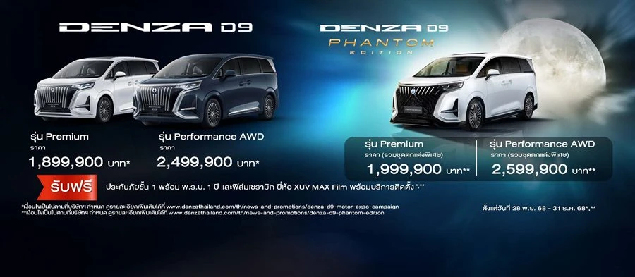 เปิดตัวครั้งแรกของไทย - DENZA D9 Phantom Edition เพิ่มความสง่างามจากชุดตกแต่งสเกิร์ตรอบคัน ทั้งยังพร้อมติดตั้งกระจังหน้าแบบใหม่ สเกิร์ตรอบคันดีไซน์สปอร์ต และชุดสปอยเลอร์ นอกจากนั้น ภายในติดตั้งจอเพดานระบบสัมผัส สำหรับผู้โดยสารตอนหลัง ขนาด 15.6 นิ้ว ให้ทุกท่านเพลิดเพลินตลอดการเดินทาง