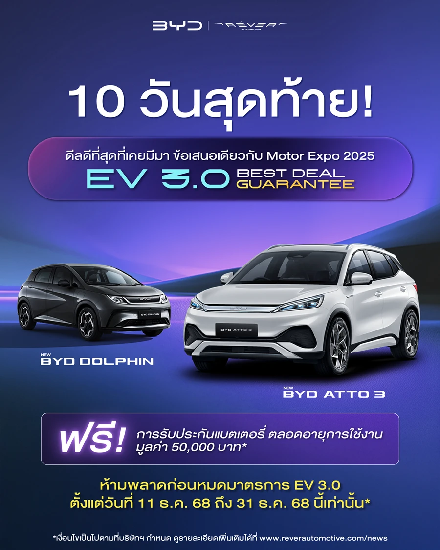 - BYD ATTO 3 ราคาพิเศษ 699,900 บาท1 ในรุ่น Extended พร้อมฟรี! แพ็คเกจการรับประกันแบตเตอรี่ตลอดอายุการใช้งาน มูลค่า 50,000 บาท