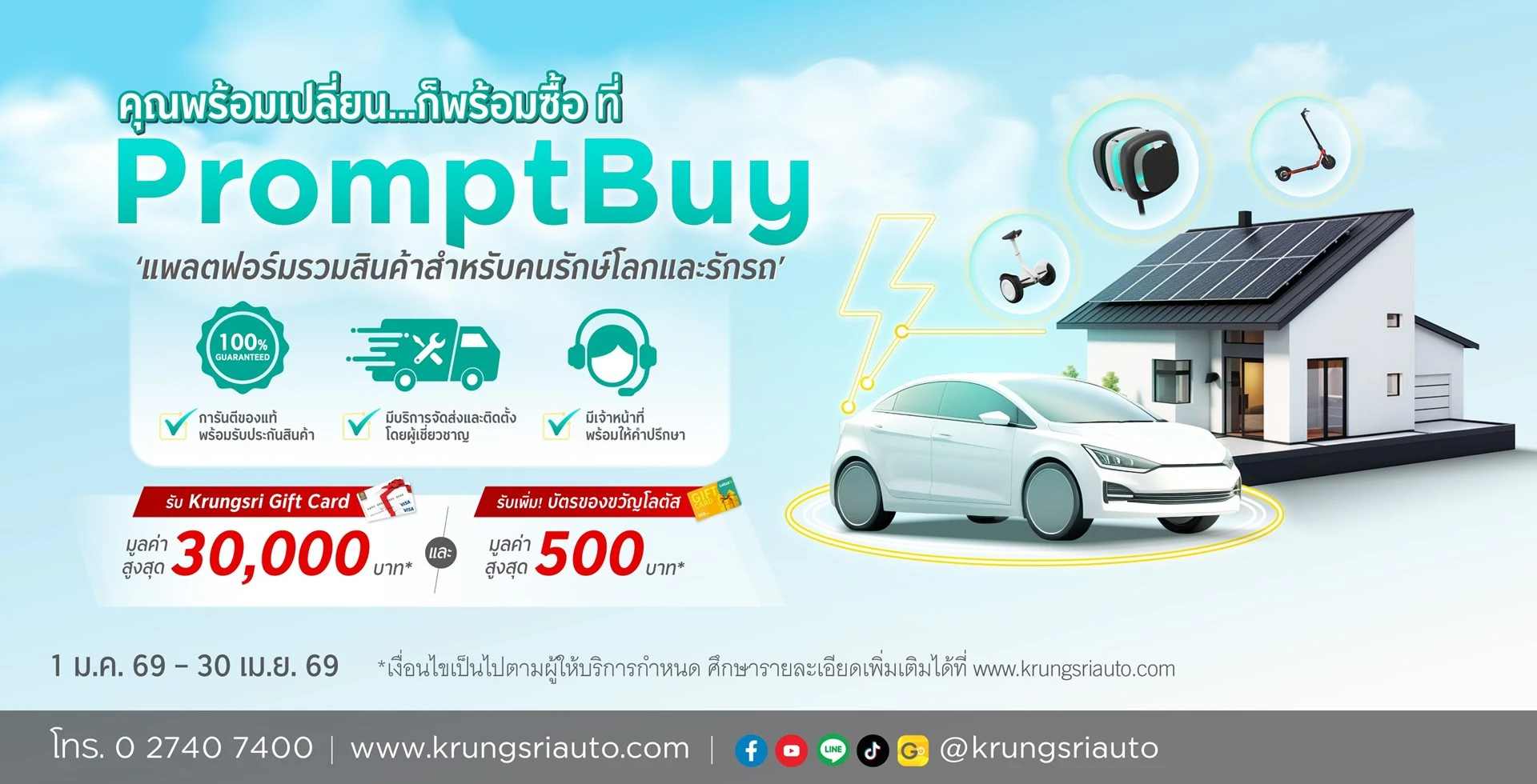 กรุงศรี ออโต้ ผู้นำธุรกิจสินเชื่อยานยนต์ครบวงจร เครือธนาคารกรุงศรีอยุธยา จำกัด (มหาชน) ชวนผู้ใช้รถช้อปให้สุดรับปีใหม่กับ PromptBuy แพลตฟอร์มรวมสินค้าสำหรับคนรักษ์โลกและรักรถ ที่คัดสรรสินค้าและบริการคุณภาพไว้ครบจบในที่เดียว ตั้งแต่ของแต่งรถ อุปกรณ์ดูแลรักษารถ บริการช่วยเหลือฉุกเฉิน ไปจนถึงโซลูชันด้านเทคโนโลยีเพื่อสิ่งแวดล้อมสำหรับที่อยู่อาศัย พร้อมเตรียมมอบของขวัญสุดคุ้ม มูลค่ารวมกว่า 30,500 บาท และสิทธิ์ผ่อน 0% นานสูงสุด 10 เดือน เพียงชำระผ่านบัตรเครดิตกรุงศรี ตั้งแต่วันที่ 1 มกราคม – 30 เมษายน 2569