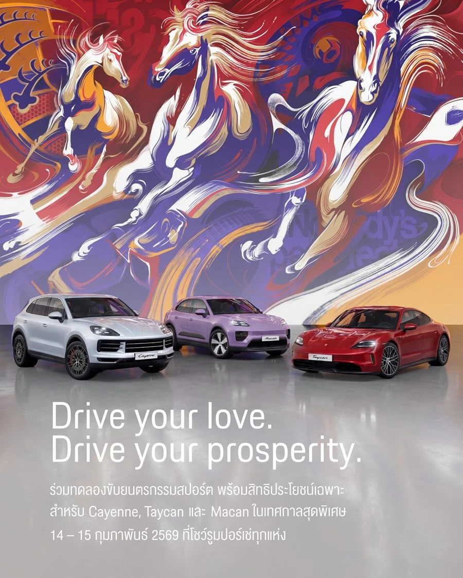 จิตวิญญาณแห่งความก้าวหน้าและความผูกพันได้สะท้อนผ่านกิจกรรม Drive Your Love. Drive Your Prosperity ที่จะจัดขึ้นในวันที่ 14–15 กุมภาพันธ์ 2569 ที่โชว์รูมปอร์เช่อย่างเป็นทางการทุกสาขา โดยมีคาเยนน์ เอส อี-ไฮบริด คูเป้ เป็นไฮไลต์สำคัญ พร้อมจัดแสดงร่วมกับมาคันน์ ไทคานน์ และรุ่นอื่น ๆ ภายใต้บรรยากาศที่สะท้อนนิมิตหมายในการเริ่มต้นใหม่และความสัมพันธ์ที่มีความหมาย ผู้ร่วมงานสามารถสัมผัสคาเยนน์และยนตรกรรมรุ่นอื่น ๆ ผ่านกิจกรรมทดลองขับที่ออกแบบมาเพื่อสะท้อนสมดุลระหว่างสมรรถนะและความอเนกประสงค์ในการใช้งานจริงและยังมีกิจกรรมเวิร์กช็อปสุดพิเศษเพื่อสร้างช่วงเวลาแห่งความประทับใจในบรรยากาศสุดพรีเมียมในแบบฉบับของปอร์เช่ รวมทั้งพร้อมมอบสิทธิพิเศษสำหรับรถรุ่นที่ร่วมรายการ
