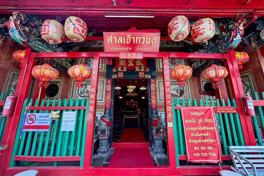 จากนั้นเดินทางต่อสู่ ศาลเจ้ากวนอู ย่านคลองสานที่กำลังเป็นกระแสด้วยการขับเคลื่อนของร้านเก๋ ร้านดัง ทั้งร้านอาหาร คาเฟ่ ร้านจำหน่ายของที่ระลึกมากมาย โดยศาลเจ้าเก่าแก่ที่ก่อตั้งมาตั้งแต่สมัยกรุงศรีอยุธยาตอนปลาย และได้รับการยอมรับว่าเป็นศาลเจ้ากวนอูที่เก่าแก่ที่สุดในประเทศไทย กว่า 290 ปี เทพกวนอู หรือ “อากง” ของชุมชน เป็นสัญลักษณ์แห่งคุณธรรม ความซื่อสัตย์ และความสำเร็จด้านการค้า ผู้ศรัทธานิยมไหว้ขอพรด้านการงาน การค้าขาย เงินทอง และความก้าวหน้าในชีวิต สำหรับการสักการะตามแนวปฏิบัติที่ใช้ ธูป 11 ดอก และเทียน 1 คู่ โดยเริ่มกราบไหว้ เทวดาฟ้าดิน ด้วยธูป 5 ดอก จากนั้นไหว้องค์เทพกวนอู ด้วยธูป 3 ดอก และไหว้พระโพธิสัตว์กวนอิม ด้วยธูปอีก 3 ดอก ก่อนปิดท้ายด้วยพิธี จับเท้าขอพรเทพกวนอู ซึ่งเป็นเอกลักษณ์ของศาลเจ้าแห่งนี้ ซึ่งศักดิ์สิทธิ์ทั้งด้านการงาน การเงิน การเรียน รวมถึงเรื่องการซื้อขายที่ดิน ทั้งนี้ เส้นทางเข้าสู่ศาลเจ้าต้องลัดเลาะผ่านชุมชนวัดอนงค์ ใกล้สวนสมเด็จพระศรีนครินทร์ริมแม่น้ำเจ้าพระยา ช่วยถ่ายทอดบรรยากาศของชุมชนดั้งเดิมที่อบอวลด้วยความศรัทธา และเติมความอิ่มใจให้กับทริปตรุษจีนตลอดการเดินทาง
