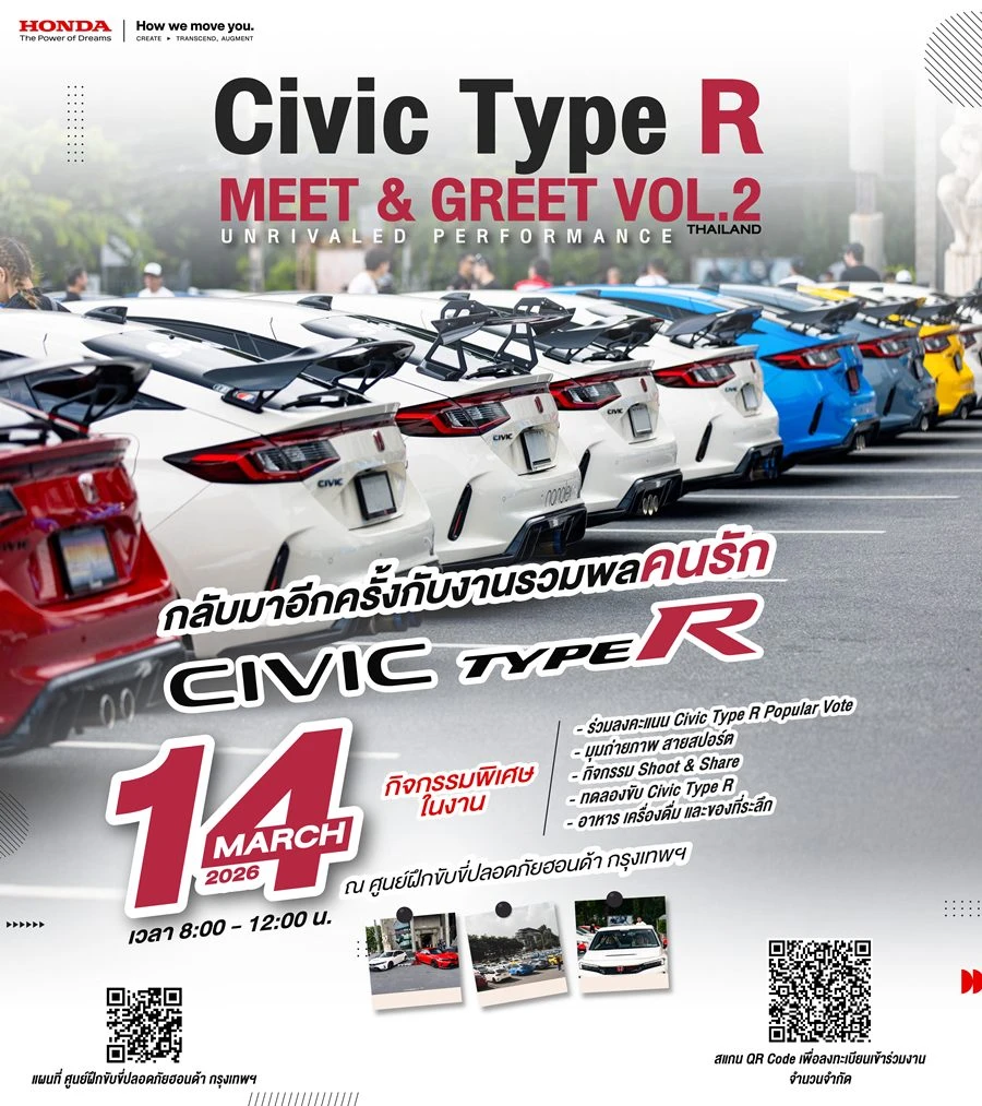 บริษัท ฮอนด้า ออโตโมบิล (ประเทศไทย) จำกัด จัดงานรวมตัวครั้งยิ่งใหญ่ของชาวแฟน ๆ สายสปอร์ตคนรัก Honda Civic Type R ในกิจกรรม Honda Civic Type R Fan Meet #2: The Unrivaled Performance ในวันเสาร์ที่ 14 มีนาคม 2569 ณ ศูนย์ฝึกขับขี่ปลอดภัยฮอนด้า ถนนรามคำแหง พร้อมเปิดรับสมัครผู้ที่สนใจเข้าร่วมกิจกรรมโดยลงทะเบียนผ่าน QR Code ในภาพผ่านช่องทาง Facebook: Honda Thailand ตั้งแต่วันที่ 24 กุมภาพันธ์ – 5 มีนาคม 2569 สิทธิ์มีจำนวนจำกัด