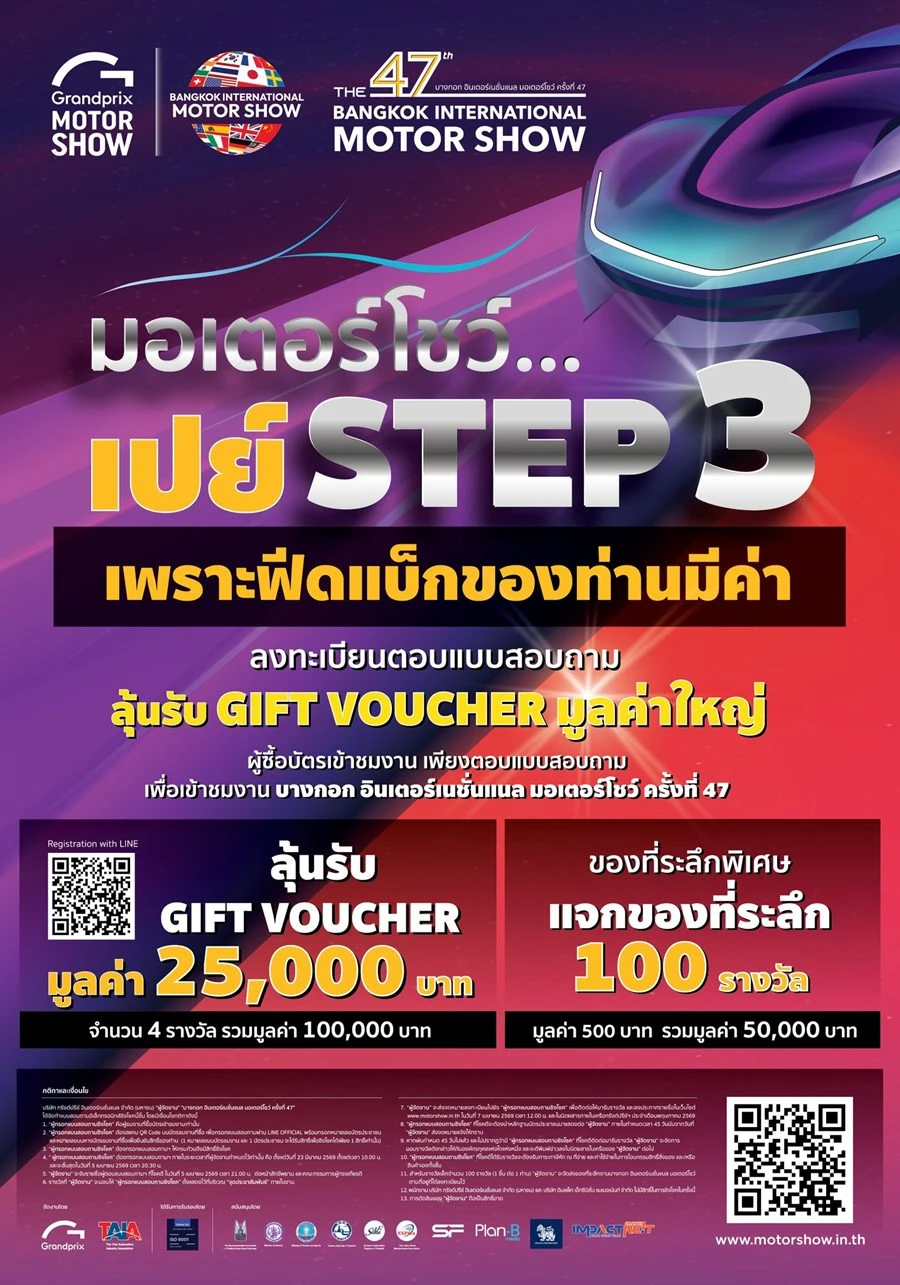 ขอเชิญชวนประชาชนและผู้สนใจทุกท่าน ร่วมสัมผัสนวัตกรรมยานยนต์ที่ตอบโจทย์ทุกไลฟ์สไตล์ และยกระดับคุณภาพชีวิตแห่งอนาคต ได้ที่ งานบางกอก อินเตอร์เนชั่นแนล มอเตอร์โชว์ ครั้งที่ 47 ระหว่างวันที่ 25 มีนาคม – 5 เมษายน 2569 ณ อิมแพค ชาเลนเจอร์ ฮอลล์ 1–3 เมืองทองธานี