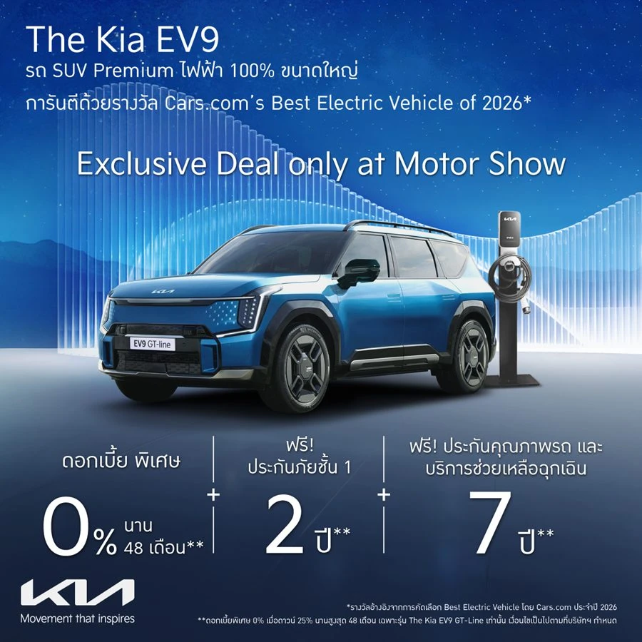 นอกจากนี้ เกีย เซลส์ (ประเทศไทย) ยังมาพร้อมกับข้อเสนอที่น่าสนใจอีกมากมาย เช่น The Kia Carnival HEV 7-Seater ที่เพิ่งเปิดตัวและได้รับรางวัล Best Hybrid MPV under 1,600 cc จาก Car Of The Year Award 2026 รวมถึง The Kia EV5, The Kia EV9 และ The Kia Sorento PHEV ทางบริษัทฯพร้อมมอบข้อเสนอสําหรับลูกค้าที่สนใจ อาทิเช่น ข้อเสนอราคาพิเศษ อัตราดอกเบี้ยพิเศษ และแพ็กเกจความคุ้มครองพิเศษ อาทิ การรับประกันคุณภาพ ประกันภัยชั้น 1 พร้อม พ.ร.บ. บริการช่วยเหลือฉุกเฉิน 24 ชั่วโมง การรับประกันแบตเตอรี่รถยนต์ (High-Voltage Battery) สำหรับรถกลุ่มอีวี (EV) ไฮบริด (HEV) และปลั๊กอินไฮบริด (PHEV) เป็นต้น