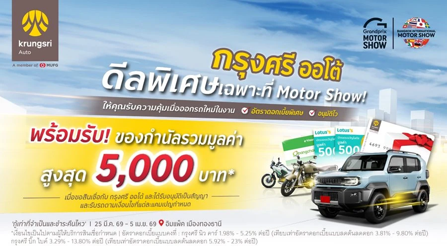 • สินเชื่อรถใหม่ “กรุงศรี นิว คาร์” อัตราดอกเบี้ยเริ่มต้น 1.98% พร้อมลุ้นรับของกำนัลมูลค่าสูงสุด 5,000 บาทต่อสัญญา ประกอบด้วย Krungsri Gift Card มูลค่า 1,000 บาท สำหรับลูกค้าที่ได้รับอนุมัติและรับรถภายในวันที่ 30 มิถุนายน 2569 รับสิทธิ์ลุ้นรางวัลจากกิจกรรมภายในบูธ มูลค่าสูงสุด 3,000 บาท และรับเพิ่ม Lotus’s E-Coupons มูลค่าสูงสุด 1,000 บาท สำหรับรถยนต์ไฟฟ้าและไฮบริด เมื่อชำระค่างวด 3 งวดแรก ผ่าน Krungsri Auto Direct Debit