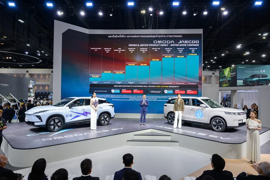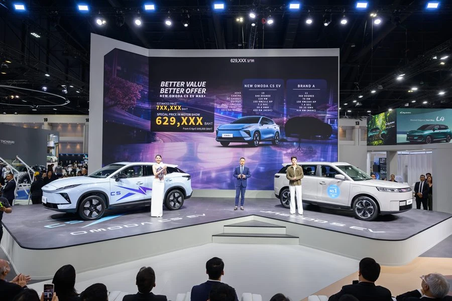 ไฮไลต์สำคัญของปีนี้คือการเปิดตัว THE NEW OMODA C5 EV MAX+ ครั้งแรกในประเทศไทย กับการประกาศราคาคาดการณ์ 7xx,xxx บาท และสำหรับภายในช่วง Motor Show 23 มีนาคม – 5 เมษายน 2569 ลงทะเบียนจองสิทธิ์รับราคาพิเศษ 629,xxx บาท* (ก่อนปรับเป็น 649,xxx บาท ตั้งแต่วันที่ 6 เมษายน 2569 เป็นต้นไป)
