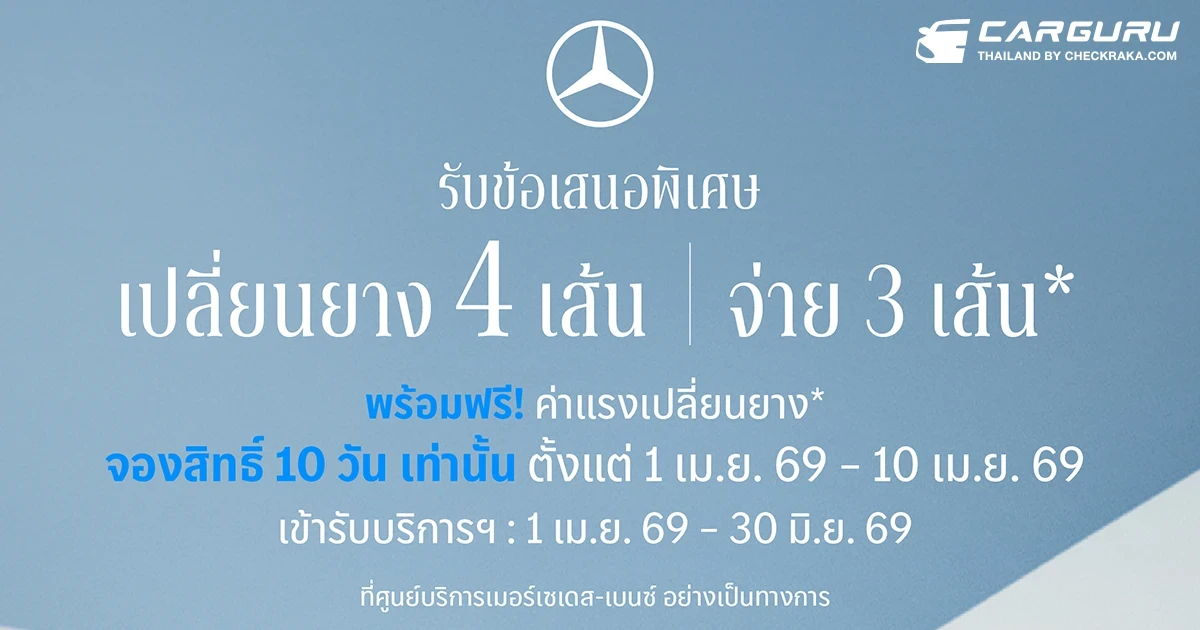 - สิทธิพิเศษสำหรับลูกค้าที่จองสิทธิ์เปลี่ยนยางรถยนต์เมอร์เซเดส-เบนซ์ จำนวน 4 เส้น เฉพาะยี่ห้อ Michelin, Pirelli, Continental, Goodyear, Bridgestone, Yokohama ที่ศูนย์บริการฯ ที่เข้าร่วมโปรแกรม MB Tires ตั้งแต่ 1 เม.ย. 69 – 10 เม.ย. 69 และชำระค่าใช้จ่ายภายในระยะเวลาตั้งแต่ 1 เม.ย. 69 – 30 มิ.ย. 69