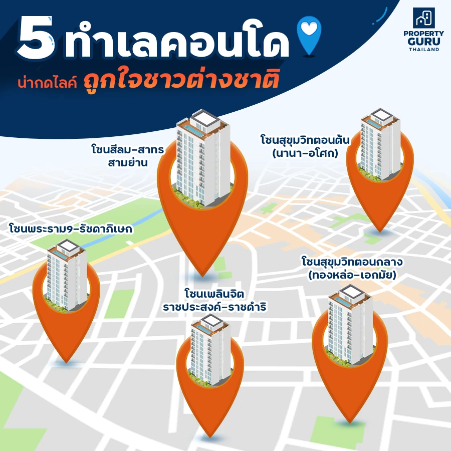 ทำเลในกรุงเทพที่น่าสนใจก็มีหลากหลายทำเล แต่ถ้าหากสังเกตดีๆ จะพบว่าชาวต่างชาตินั้นมักจะอยู่กันเป็นกลุ่มก้อนและเป็นโซนๆ ค่ะ โดยเฉพาะชาวเอเชีย เช่น จีน เกาหลี ญี่ปุ่น มักจะอยู่กันเป็นชุมชนเพื่อความอบอุ่นใจ ส่วนชาวยุโรปหรือชาติอื่นๆ ก็มักจะเน้นที่ความสะดวกสบายในการเดินทางมาทำงาน อยู่ใกล้กับศูนย์กลางธุรกิจ หากมองในภาพรวมแล้วก็จะเห็นว่าทำเลที่ชาวต่างชาติมักจะเลือกอยู่อาศัยก็คือตามแนวรถไฟฟ้าค่ะ จากฐานข้อมูลของ Bangkok Citismart ทาง Checkraka ได้ศึกษาข้อมูลและพบว่าชาวต่างชาตินิยมอยู่คอนโดในโซนต่อไปนี้