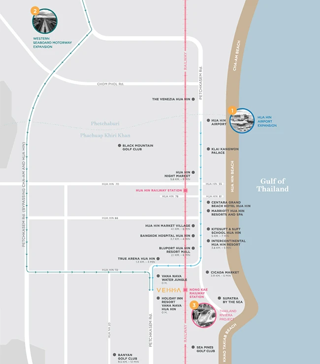 เวหา หัวหิน ภายใต้คอนเซปต์ "New Lifestyle Seaview Residences" คอนโดตั้งอยู่บนถนนเพชรเกษม ด้านหลังยังมีสวนน้ำ วานา นาวา โดดเด่นด้วยการออกแบบ Single Corridor ทำให้ทุกยูนิตได้รับวิวทะเลแบบเต็มที่ และจัดเต็มไปกับสิ่งอำนวยความสะดวกมากมาย ที่จะทำให้การอยู่อาศัยสมบูรณ์แบบ