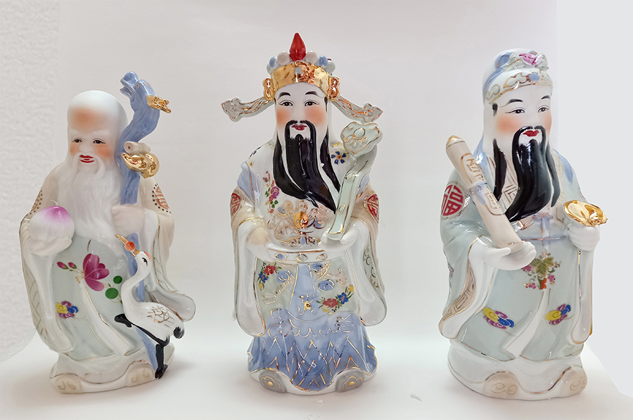 เชื่อกันว่าหากตั้งเทพเจ้าทั้ง 3 องค์นี้ไว้ในห้องรับแขก เทพเจ้าทั้ง 3 นี้ จะช่วยดลบันดาลให้คุณมั่งคั่ง ร่ำรวย มียศศักดิ์ และสุขภาพแข็งแรง โดยหลักแล้ว ควรตั้งในจุดที่มีแสงสว่างพอสมควร ไม่อยู่ในมุมทึบหรืออับเกินไป และควรหมั่นดูแลทำความสะอาดอย่าให้ฝุ่นจับท่านด้วย ทั้งนี้ ความเชื่อทางฮวงจุ้ยสำหรับเทพเจ้าแต่ละองค์นั้นเป็นดังนี้