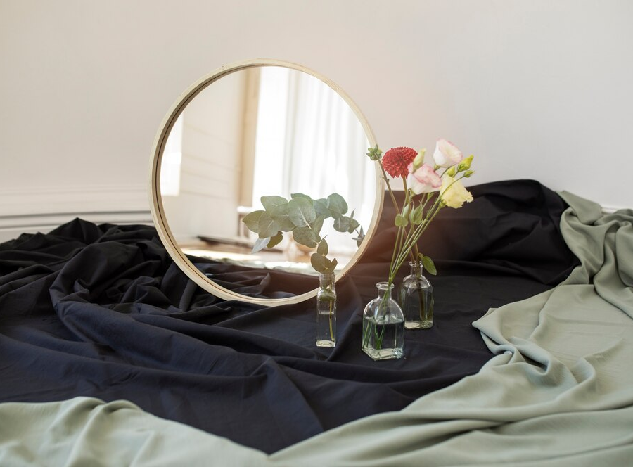 ความเชื่อในแง่ฮวงจุ้ยของกระจกเงาก็คือ วัสดุแวววาวสามารถทำหน้าที่ได้ทั้งสองแบบ คือเป็นการสะท้อนสิ่งชั่วร้าย (แก้ฮวงจุ้ยที่ไม่ดี) และในขณะเดียวกันก็ช่วยเพิ่มพลังที่ดีได้ (เสริมฮวงจุ้ยที่ดี) ดังนั้น เราต้องนำกระจกเงามาใช้อย่างเหมาะสม ตัวอย่างในเรื่องสำคัญๆ ก็เช่น ไม่ควรวางกระจกเงาสองบานชนกัน เพราะจะเป็นการสะท้อนกระแสพลังโต้กันไปโต้กันมาอยู่ในบ้าน ไม่ควรวางกระจกให้ตรงไปที่เตียงนอน หรือบนเพดานเหนือเตียง เพราะการติดกระจกเงาเอาไว้ในตำแหน่งดังกล่าวจะทำให้มีปัญหาเกี่ยวกับบุคคลที่สามเข้ามาแทรกแซงในชีวิตคู่ นอกจากนี้ กระจกไม่ควรให้สะท้อนไปยังประตูบานใดบานหนึ่ง เพราะมีความเชื่อว่าจะเป็นการสะท้อนโชคลาภให้ออกไป