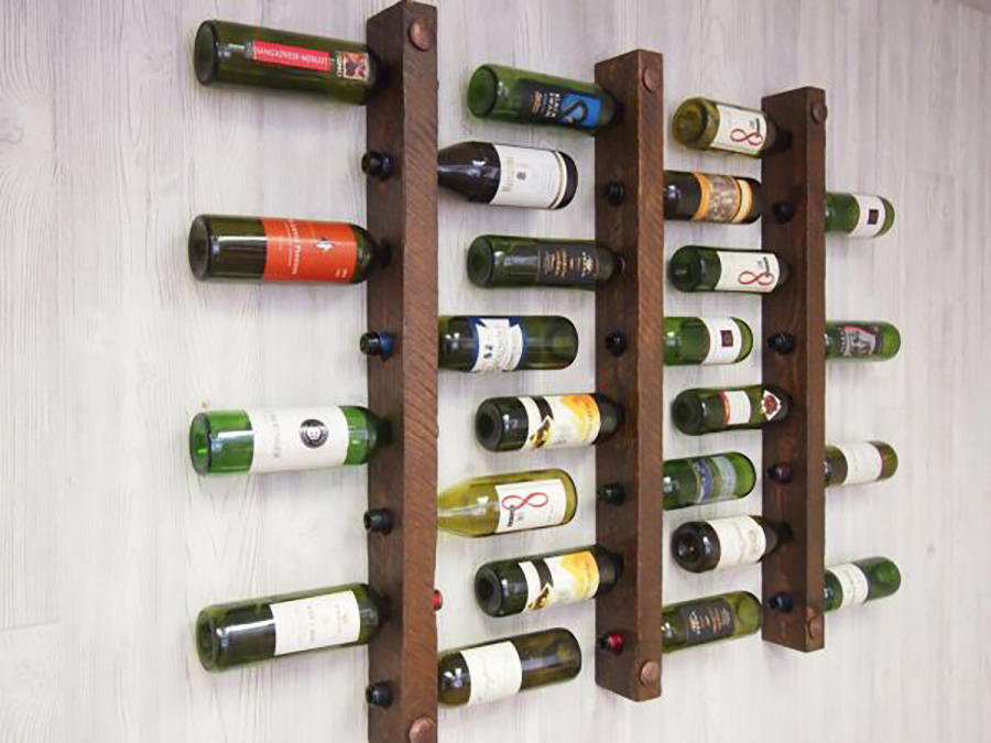 ที่แขวนไวน์ชุดนี้ไม่กินเนื้อที่ เพราะสามารถติดแนบเข้ากับกำแพงได้อย่างแนบเนียน และกลมกลืนกับเฟอร์นิเจอร์สีไม้ Oak อื่นๆ แขวนขวดไวน์ได้ 24 ขวด แต่มองดูแล้วก็เสียวๆ ว่าถ้าเดินเฉี่ยวเดินชน จะเอาอยู่...ไม่หล่นลงมาหรือเปล่า