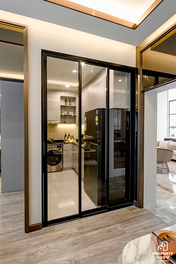 2. ประตูกระจก : นอกจากประตูกระจกตรงระเบียงแล้วประตูที่เป็นกระจกทุกจุดก็เป็นจุดเสี่ยงที่ควรระวังเช่นกัน เพราะเด็กๆ อาจเดินไม่ระวังแล้วเดินชนกระจกทำให้เจ็บตัวได้ เช่น บานประตูกระจกบริเวณครัวตามรูปข้างบน