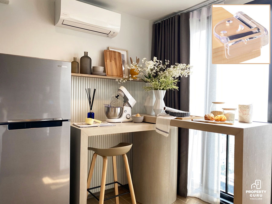 1. ประตูตรงระเบียง : ส่วนใหญ่ของหลายๆ โครงการจะเป็นประตูใสแบบบานเลื่อน เพราะทำให้ห้องดูโปร่ง และสามารถชมความสวยงามของวิวด้านนอกอาคารได้ แต่ประตูแบบนี้สำหรับเด็ก 3-4 ขวบขึ้นไปอาจสามารถจะเปิดออกเองได้แล้ว ซึ่งหากเปิดไปออกไปเล่นที่ระเบียงในขณะที่ไม่มีผู้ใหญ่ดูแลอาจทำให้พลัดตกลงไปได้ ในแง่การดีไซน์เพื่อความปลอดภัยของเด็กนั้น ประตูกระจกบานเลื่อนพวกนี้ควรเป็นบานประตูที่เปิดยากสำหรับเด็กๆ ไม่ว่าจะเป็นดีไซน์ที่ทำให้มีน้ำหนักมากขึ้น หรือมีตัวล็อคที่กลอนบานประตู