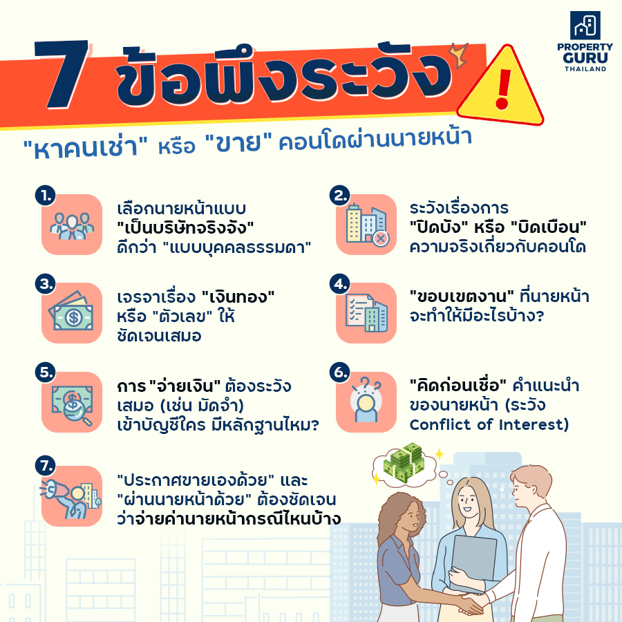 หลายคนลงทุนซื้อคอนโดมาปล่อยเช่า หรือเก็งกำไรปล่อยขาย แต่ปัจจุบัน Supply ของคอนโดบ้านเราค่อนข้างเยอะมากค่ะ ถ้าโครงการไหนทำเลไม่ดีจริง หรือไม่มี Selling Point เด่นๆ การปล่อยเช่า หรือขายต่ออาจไม่ง่ายนัก ทำให้หลายคนใช้บริการ "นายหน้า" แต่ต้องระวังนิดนะคะ วงการนายหน้าซื้อขายอสังหาฯ บ้านเราไม่มีกฎหมายควบคุมเหมือนนายหน้าซื้อขายหุ้น หรือประกันชีวิตค่ะ จึงทำให้ "ใครก็ได้" ที่สนใจอยากเป็นนายหน้าก็เข้ามาเป็นได้ ไม่ต้องมีความเชี่ยวชาญ และที่สำคัญคือไม่มีกฎหมายให้ต้องรับผิดชอบในฐานะ "ผู้มีวิชาชีพ" ต่อผู้บริโภค ซึ่งข้อนี้สำคัญมาก เพราะนั่นหมายถึงผู้บริโภคจะต้องเสี่ยงดวงเอาเองว่าจะเจอนายหน้าแบบไหน ดังนั้นก่อนที่เราจะใช้บริการนายหน้าเพื่อ "หาคนเช่าหรือซื้อ-ขายคอนโด" เรามาดูกันค่ะว่าเราควรต้องระวังอะไรกันบ้าง