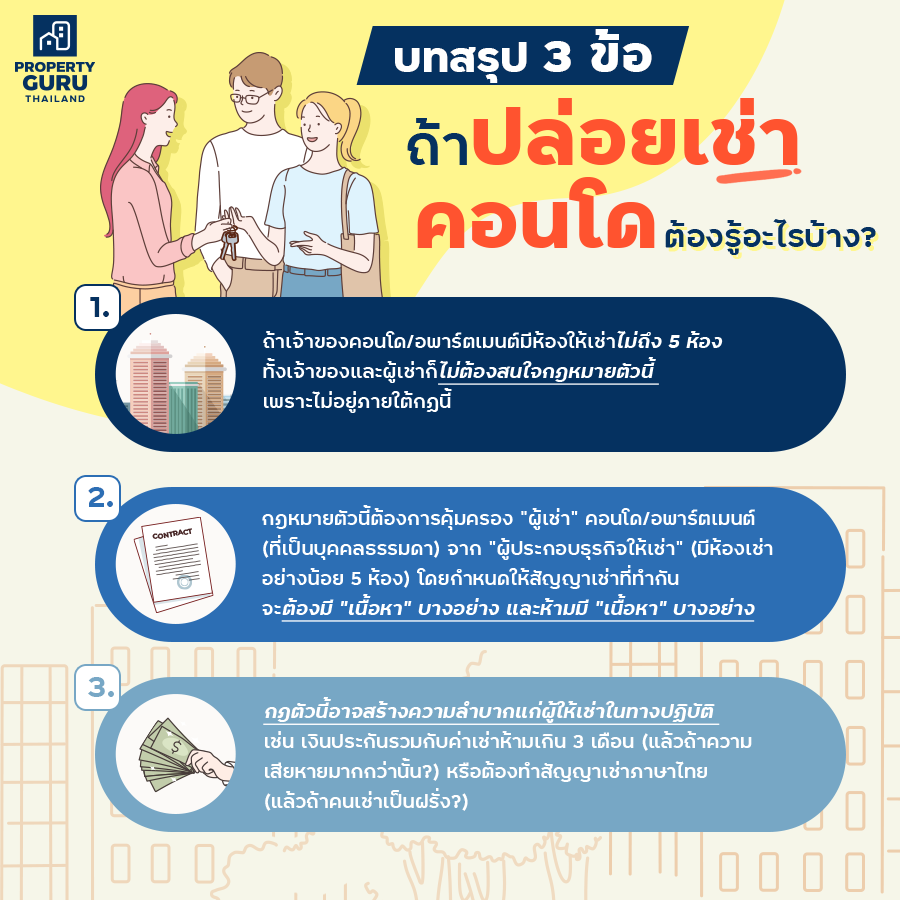 A : กระทบกับเจ้าของคอนโดที่ปล่อยเช่าเพื่อการพักอาศัยตั้งแต่ 5 ห้องขึ้นไป รวมถึงเจ้าของอพาร์ตเมนต์ ห้องพัก หรือบ้านเช่าที่ปล่อยเช่าเพื่อการพักอาศัยเกิน 5 ห้อง/หลังขึ้นไป แต่มีข้อยกเว้นในบางกรณี เช่น ถ้าห้องเช่าของเราเป็น "หอพัก" หรือ "โรงแรม" และจดทะเบียนตามกฎหมายหอพัก และโรงแรมเรียบร้อยแล้ว หรือเราปล่อยเช่าให้บริษัท หรือเพื่อการประกอบธุรกิจ (ไม่ใช่เพื่อการพักอาศัย) กรณีเหล่านี้จะไม่ต้องสนใจกฎตัวนี้เลยครับเพราะได้รับยกเว้น