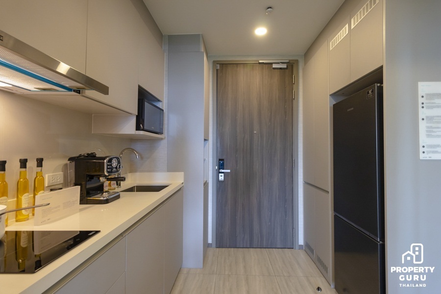 ห้องตัวอย่างแบบ 1 Bedroom ขนาด 40.74 ตร.ม. จัดวางรูปแบบฟังก์ชันการใช้งาน ให้เหมาะกับการใช้ชีวิตของคู่รักหรือครอบครัวที่กำลังมีลูกเล็ก พร้อมระบบ Home Automation ขายแบบ Fully Fitted ได้ชุดครัว Built-in, สุขภัณฑ์ในห้องน้ำ และตู้เสื้อผ้า Built-in
