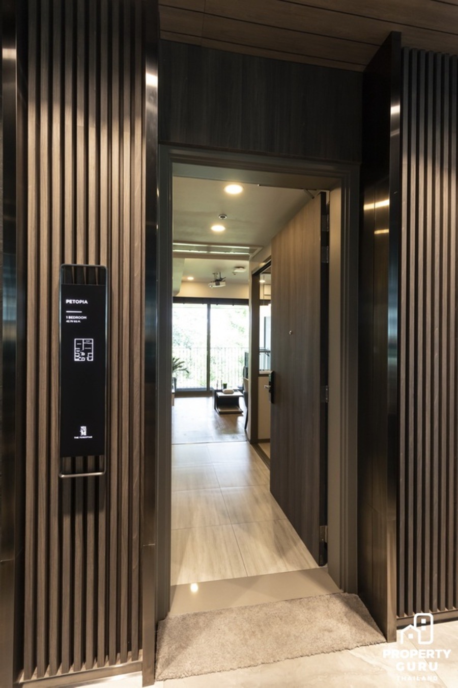 ห้องตัวอย่างของ Petopia แบบ 1 ห้องนอน ขนาด 42.79 ตร.ม. โดยความพิเศษของห้องนี้เริ่มตั้งแต่ประตู ที่ออกแบบประตูเป็น Door Seal ช่วยป้องกันเสียงจากโถงทางเดินเข้าห้องพัก พร้อมกับ Digital Door Lock ยี่ห้อ Yale