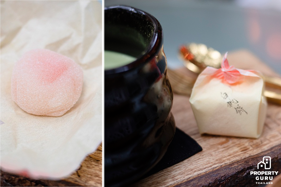 เสริฟพร้อมโมจิพีชที่นำเข้าจากญี่ปุ่น ตัวโมจิไส้พีช คือหอมมาก รสชาติออกหวานนิดๆ เมื่อทานคู่กับชาเขียวที่เข้มข้นคือเข้ากันได้อย่างดีงาม