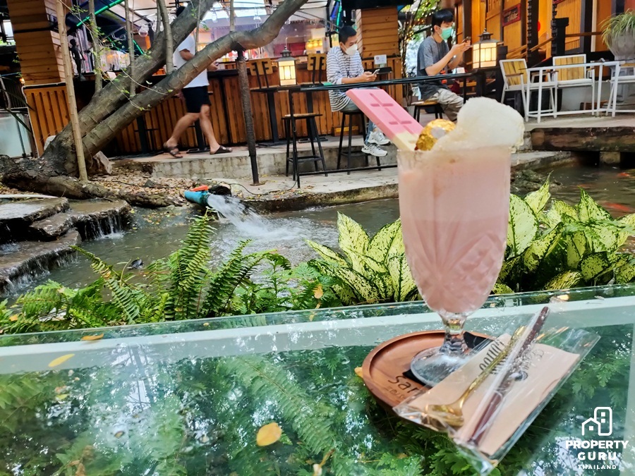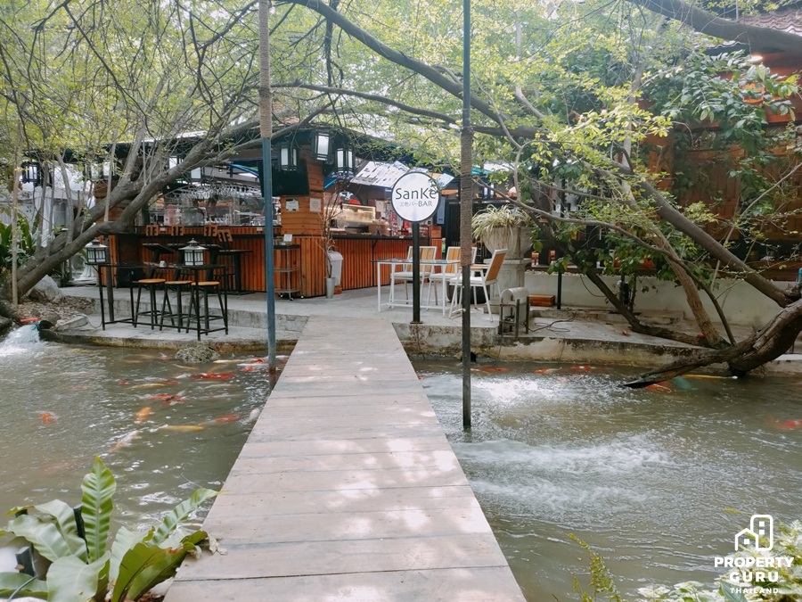 ภายในร้านมีน้ำพุเล็กๆ บ่อปลาคาร์ฟ และสะพานไม้ที่ทอดยาวเชื่อมต่อระหว่างโซนนั่งเล่นและโซนเคาน์เตอร์สั่งอาหาร ได้ฟีลล์ธรรมชาติสุดๆ