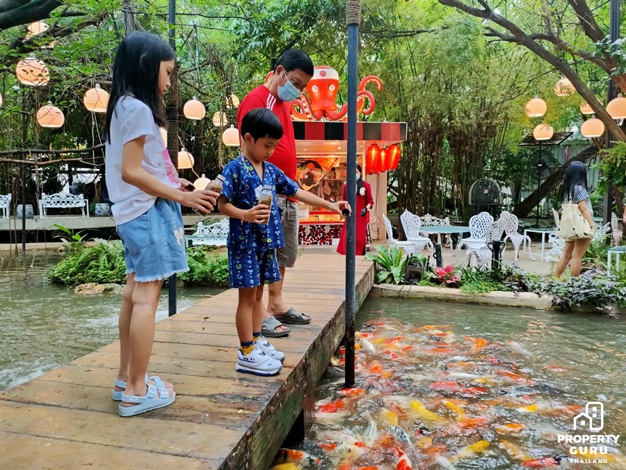 และสำหรับสายครอบครัว ก็มีกิจกรรมให้เด็กๆ ได้มาเพลิดเพลินกับการให้อาหารปลาคาร์ฟตัวโตๆ หลากสี ในราคาขวดละ 20 บาทเท่านั้น