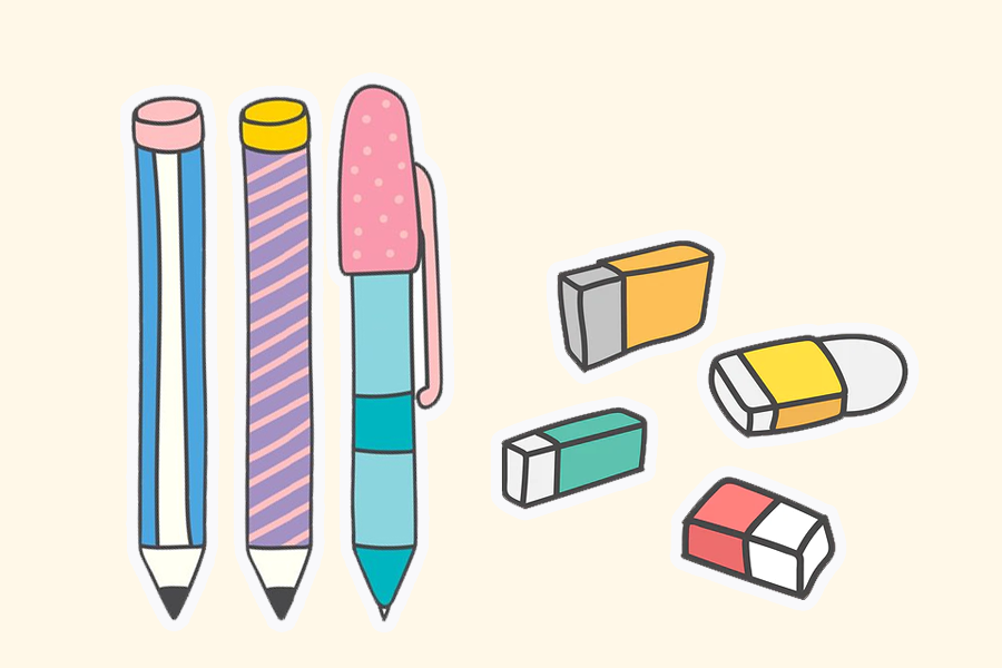 หลังจากที่เรามีกระดาษแล้ว ก็ต้องมีปากกา หรือดินสอ พร้อมอุปกรณ์สำหรับลลคำผิดอย่าง ยางลบหรือ ลิควิดเปเปอร์ไปด้วย