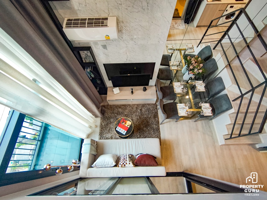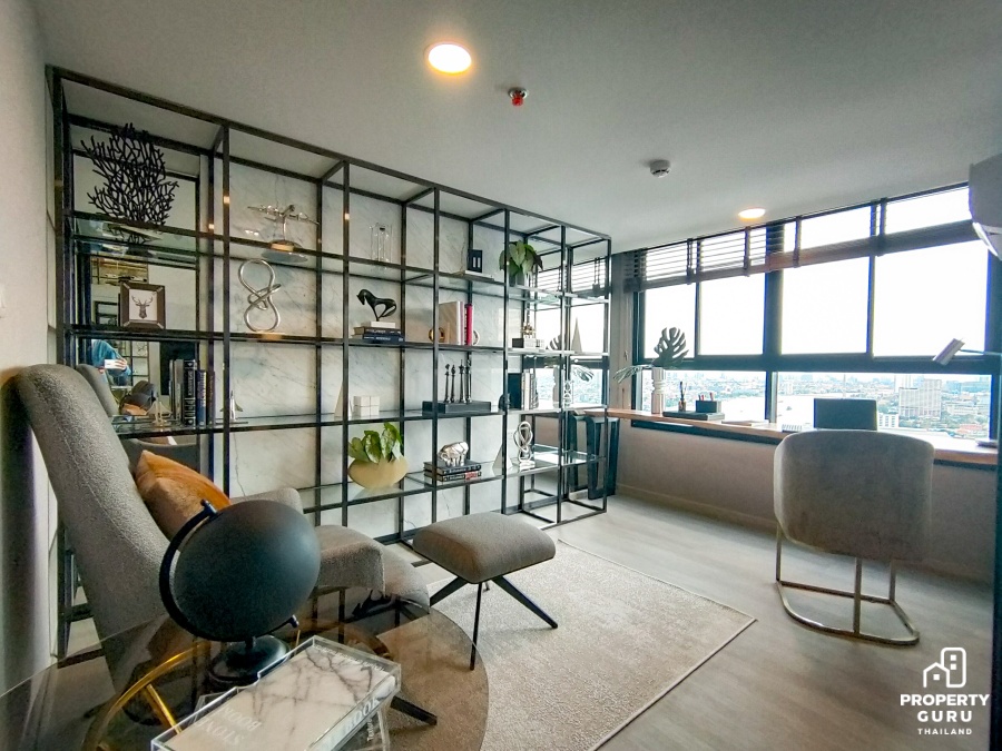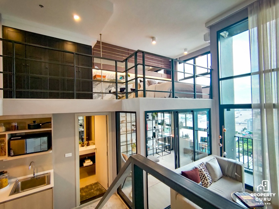 ห้อง 1 bedroom Hybrid ขนาด 34.5 ตร.ม. : ซึ่งรูปแบบห้อง Hybrid Series ถือเป็นห้องไฮไลท์ของโครงการนี้เลย ลักษณะห้อง 2 ชั้น โดดเด่นที่ Floor to ceiling สูงมากถึง 4.55 เมตร ทำให้ห้องดูโปร่งโล่ง โซนห้องนั่งเล่นได้กระจกบานสูงจากพื้นถึงฝ้าเทควิวแม่น้ำได้แบบเต็มอิ่ม มีห้องอเนกประสงค์ที่สามารถปรับเปลี่ยนฟังก์ชันใช้สอยได้ตามต้องการ ไม่ว่าจะทำเป็นห้องทำงาน ห้องแต่งตัว หรือจะทำเป็นห้องนอนก็ยังได้