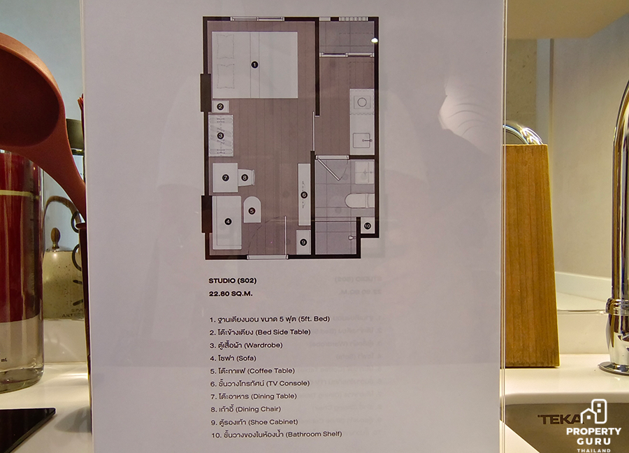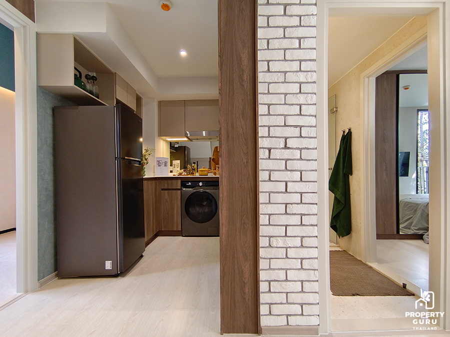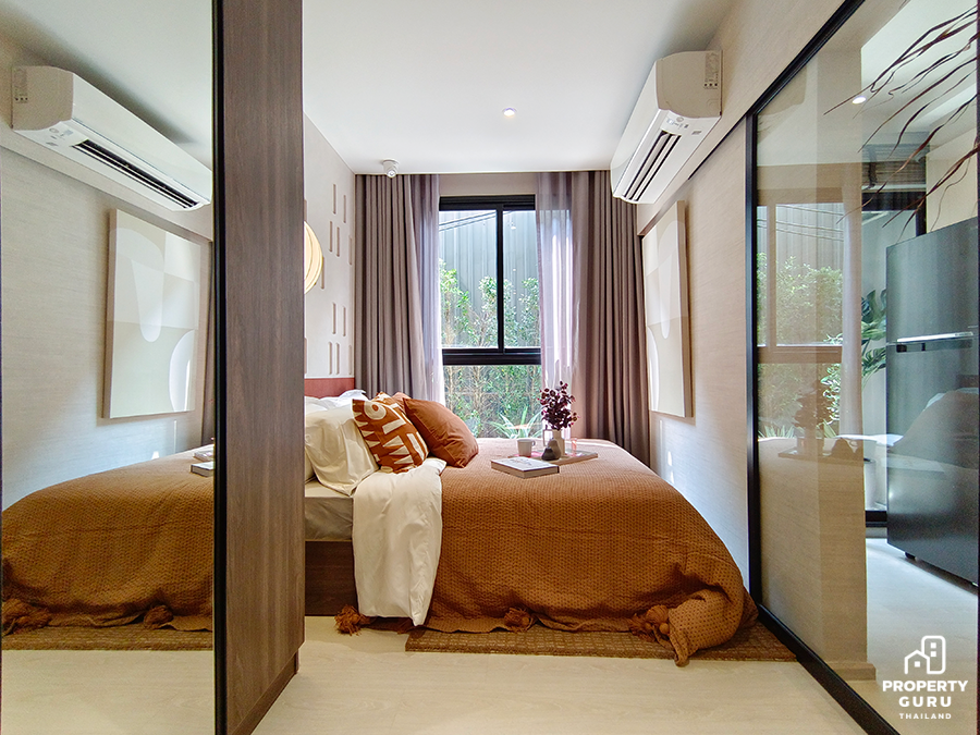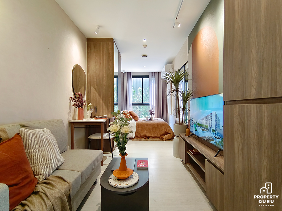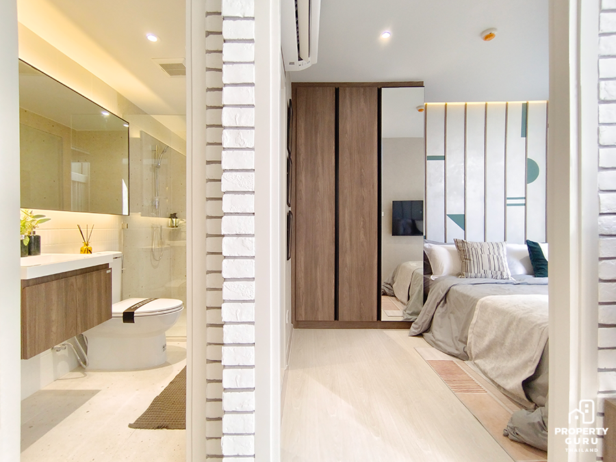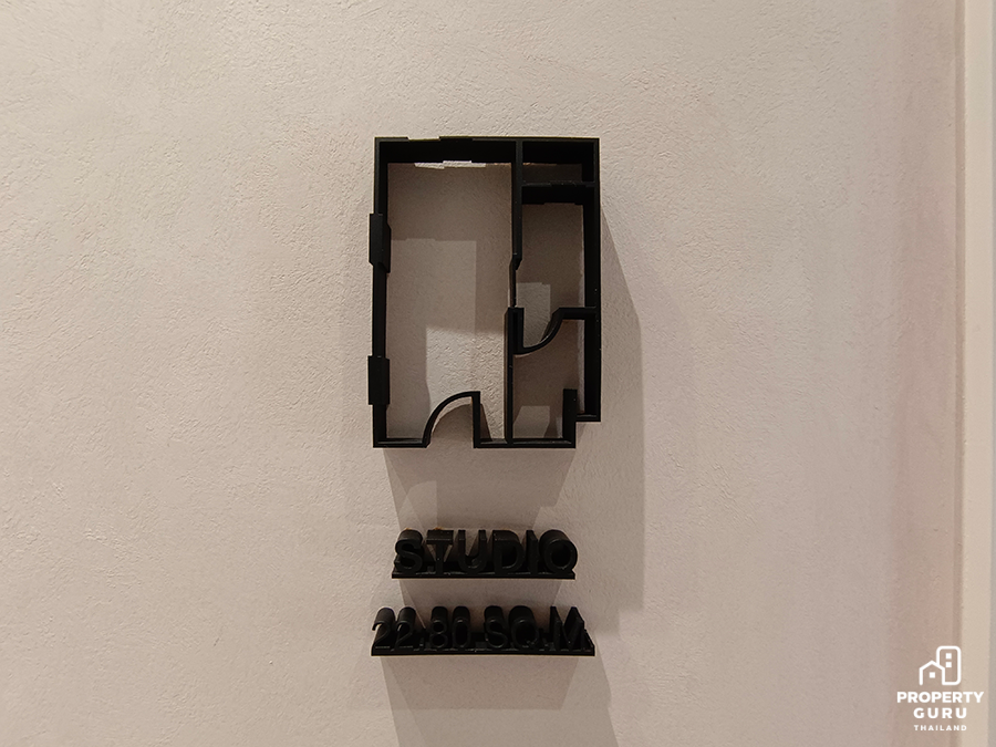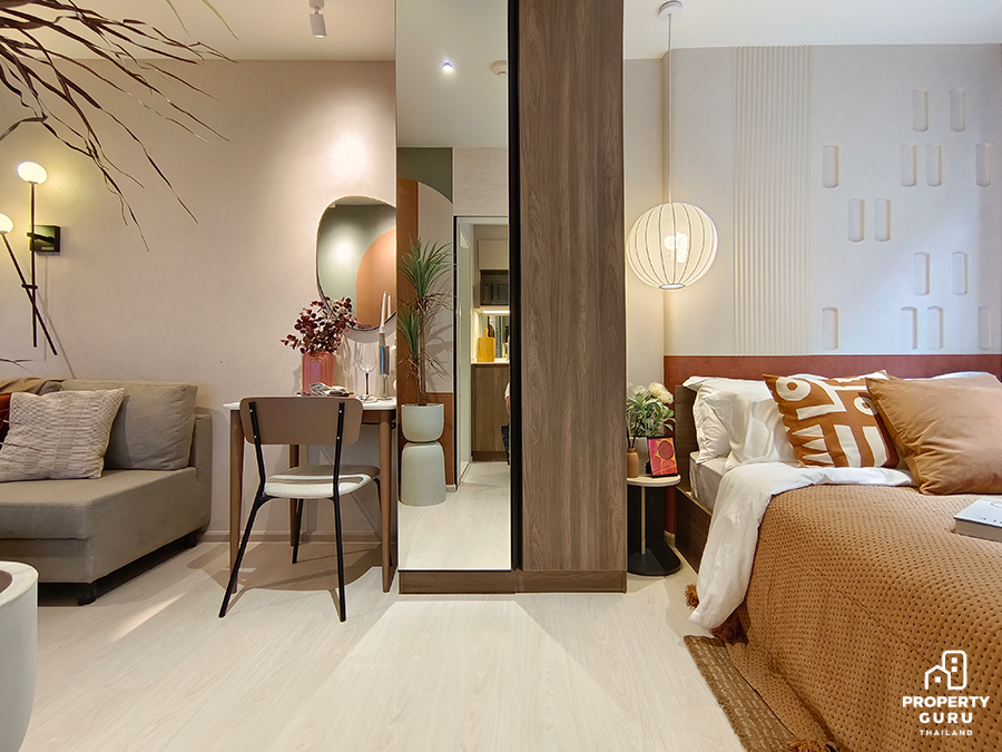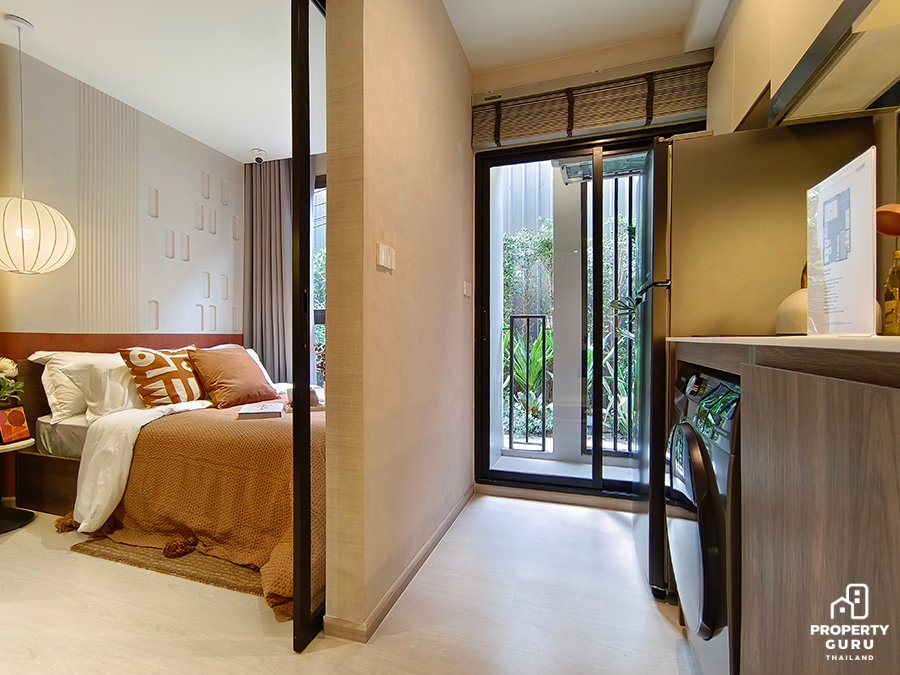 Studio 22.70-23.25 ตร.ม. ห้องมีความลึก 5 เมตร เพดานสูง 2.45 เมตร ฟังก์ชันครัวปิดประตูบานสไลด์ ได้เฟอร์นิเจอร์ครบ พร้อมเครื่องปรับอากาศ 1 เครื่อง