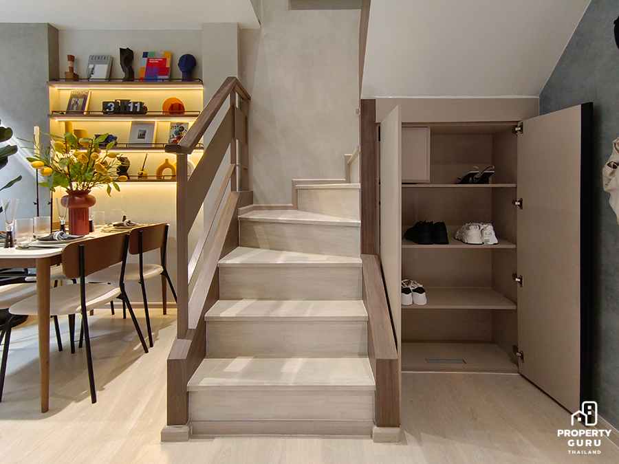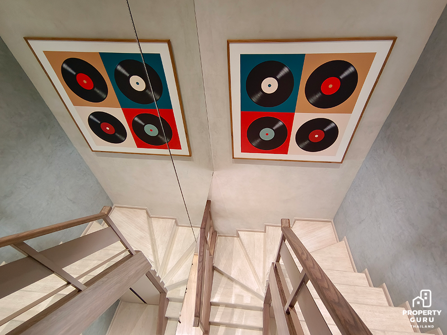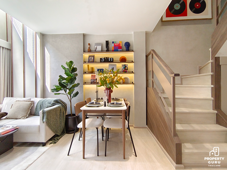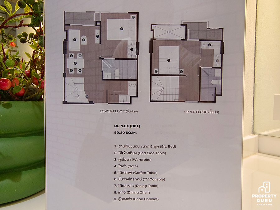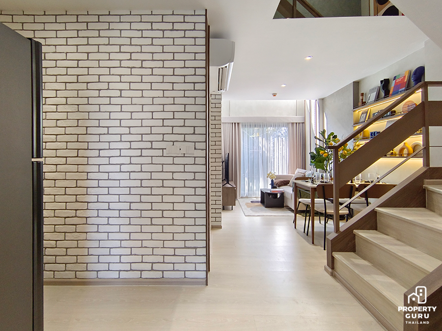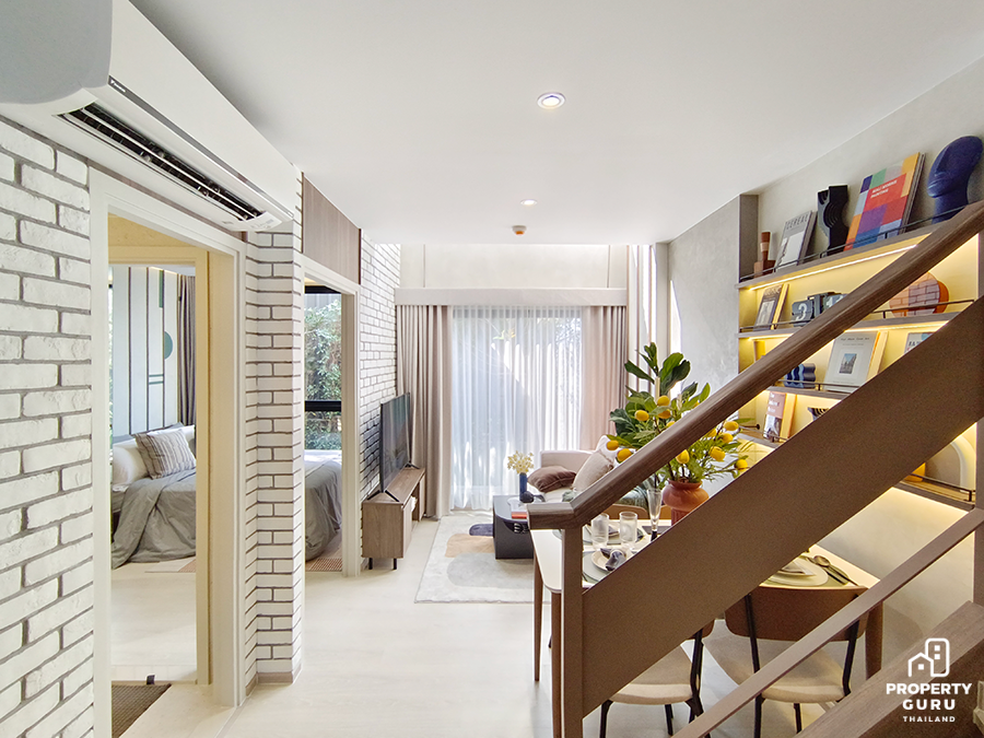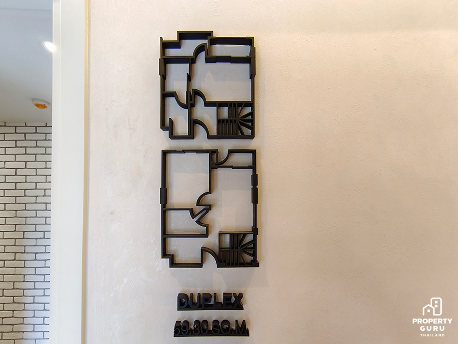 2 Bedroom Duplex 59.30 SQ.M. ตร.ม. ห้องนี้จัดเป็นแรร์ไอเทม เพราะมีเพียง 34 ยูนิตเท่านั้น เป็นห้อง 2 ชั้น ความสูงแบบ Double Volume 5.25 เมตร เฉพาะด้านบนสูง 2.45 เมตร ครัวรูปตัว L มีตู้วางรองเท้าใต้บันได ติดตั้งแอร์ให้ทุกห้อง ห้องน้ำชั้น 1 เข้าได้ 2 ทาง ห้องนอนข้างบนได้ Walk in closet
